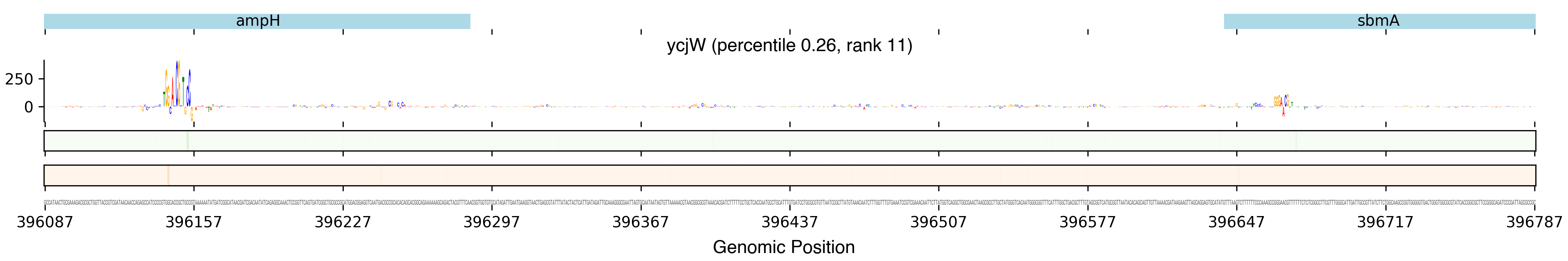 Top row shows gene annotations. Each set of panels beneath the annotation row shows the predictions for one TF. The sequence logo shows the contribution of the base at each position to the overall binding affinity, with bases above the horizontal axis contributing positive binding affinity and bases below contributing negative binding affinity. The heatmaps below the sequence logos show the exponentiated binding score at each position (the exponentiated score of the weight matrix and bias at that position). The top heatmap in green shows hits on the positive strand, and the bottom heatmap in red shows hits on the negative strand.