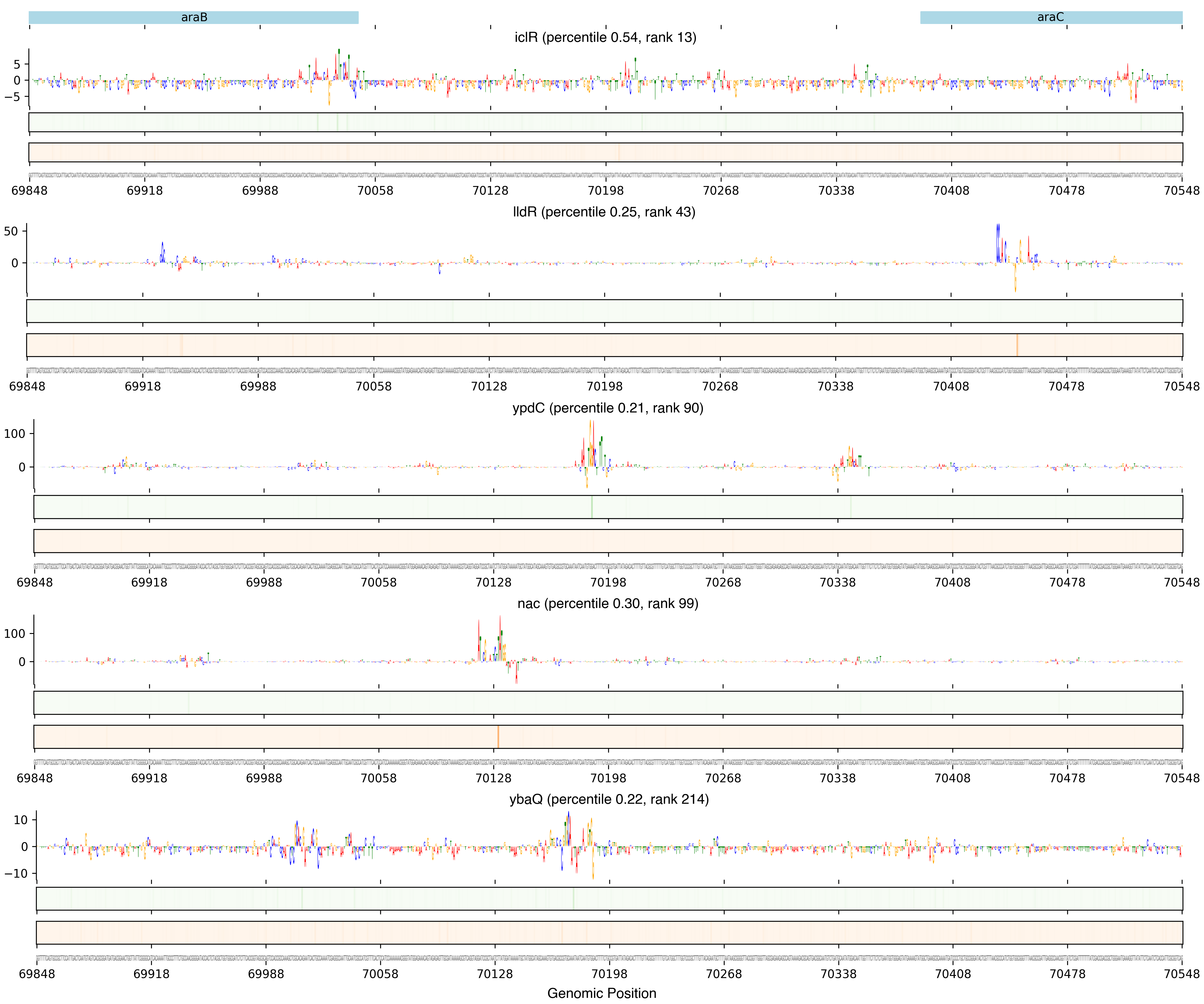 Top row shows gene annotations. Each set of panels beneath the annotation row shows the predictions for one TF. The sequence logo shows the contribution of the base at each position to the overall binding affinity, with bases above the horizontal axis contributing positive binding affinity and bases below contributing negative binding affinity. The heatmaps below the sequence logos show the exponentiated binding score at each position (the exponentiated score of the weight matrix and bias at that position). The top heatmap in green shows hits on the positive strand, and the bottom heatmap in red shows hits on the negative strand.