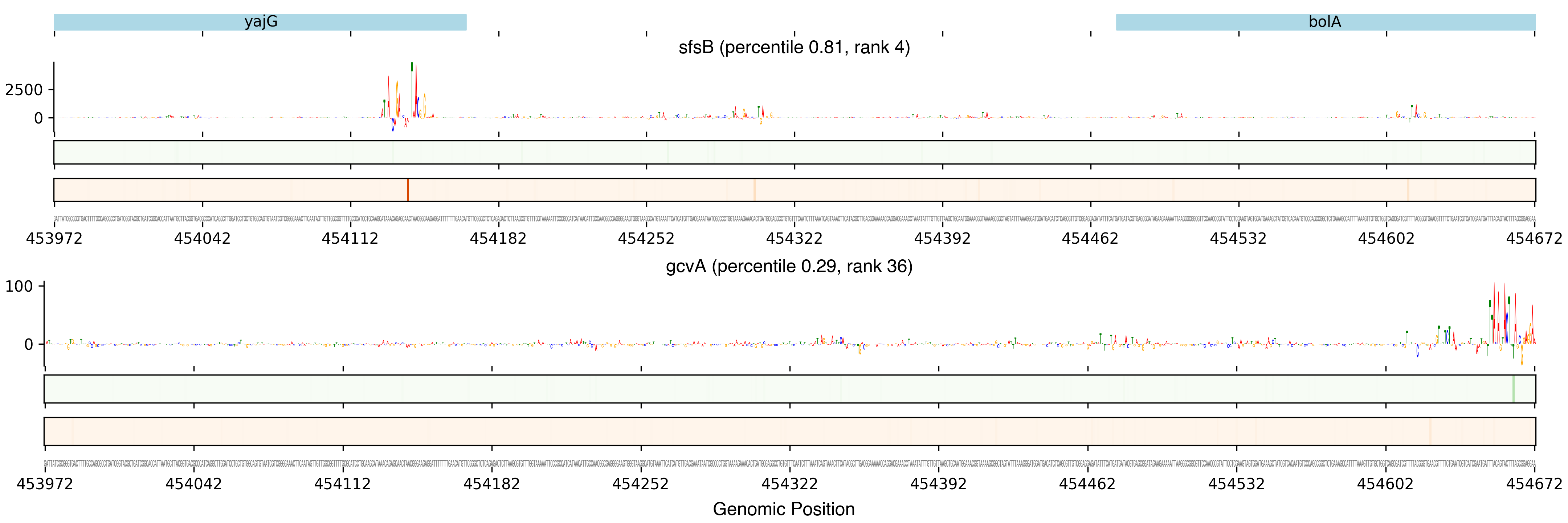Top row shows gene annotations. Each set of panels beneath the annotation row shows the predictions for one TF. The sequence logo shows the contribution of the base at each position to the overall binding affinity, with bases above the horizontal axis contributing positive binding affinity and bases below contributing negative binding affinity. The heatmaps below the sequence logos show the exponentiated binding score at each position (the exponentiated score of the weight matrix and bias at that position). The top heatmap in green shows hits on the positive strand, and the bottom heatmap in red shows hits on the negative strand.