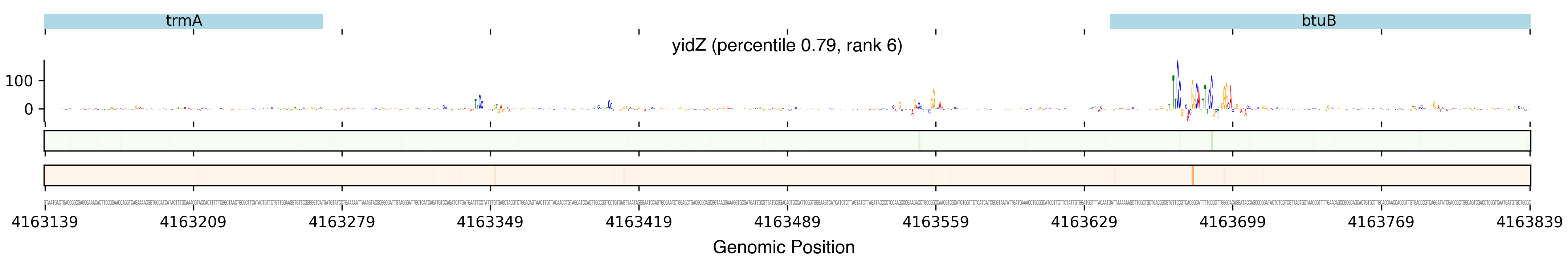 Top row shows gene annotations. Each set of panels beneath the annotation row shows the predictions for one TF. The sequence logo shows the contribution of the base at each position to the overall binding affinity, with bases above the horizontal axis contributing positive binding affinity and bases below contributing negative binding affinity. The heatmaps below the sequence logos show the exponentiated binding score at each position (the exponentiated score of the weight matrix and bias at that position). The top heatmap in green shows hits on the positive strand, and the bottom heatmap in red shows hits on the negative strand.