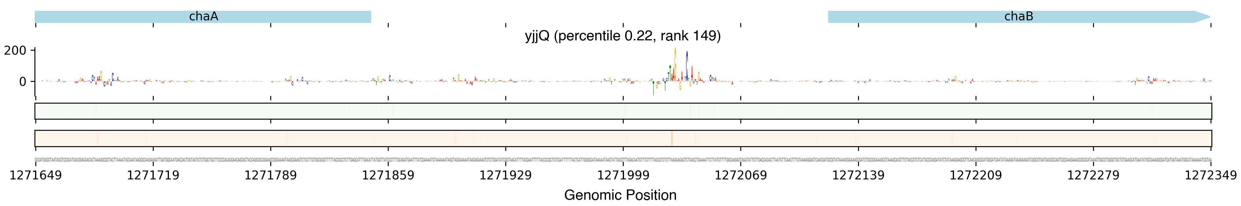 Top row shows gene annotations. Each set of panels beneath the annotation row shows the predictions for one TF. The sequence logo shows the contribution of the base at each position to the overall binding affinity, with bases above the horizontal axis contributing positive binding affinity and bases below contributing negative binding affinity. The heatmaps below the sequence logos show the exponentiated binding score at each position (the exponentiated score of the weight matrix and bias at that position). The top heatmap in green shows hits on the positive strand, and the bottom heatmap in red shows hits on the negative strand.