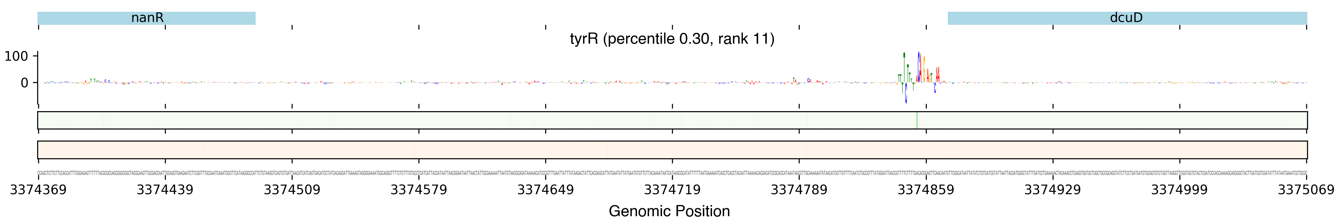 Top row shows gene annotations. Each set of panels beneath the annotation row shows the predictions for one TF. The sequence logo shows the contribution of the base at each position to the overall binding affinity, with bases above the horizontal axis contributing positive binding affinity and bases below contributing negative binding affinity. The heatmaps below the sequence logos show the exponentiated binding score at each position (the exponentiated score of the weight matrix and bias at that position). The top heatmap in green shows hits on the positive strand, and the bottom heatmap in red shows hits on the negative strand.