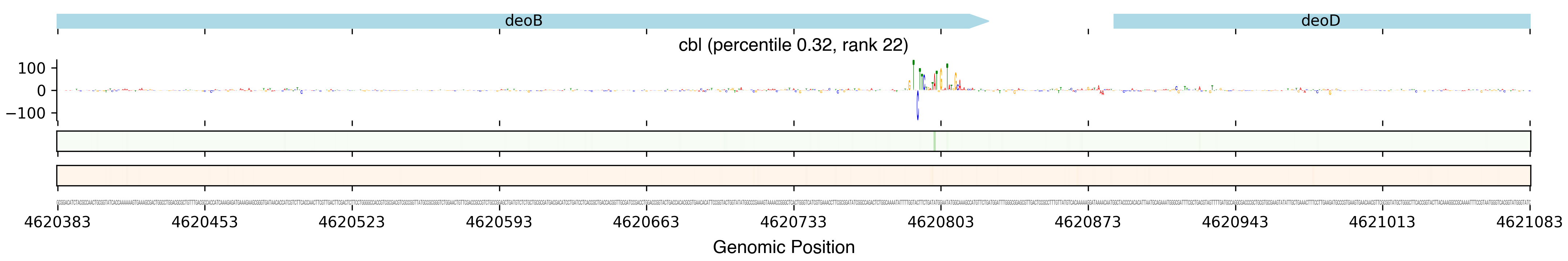 Top row shows gene annotations. Each set of panels beneath the annotation row shows the predictions for one TF. The sequence logo shows the contribution of the base at each position to the overall binding affinity, with bases above the horizontal axis contributing positive binding affinity and bases below contributing negative binding affinity. The heatmaps below the sequence logos show the exponentiated binding score at each position (the exponentiated score of the weight matrix and bias at that position). The top heatmap in green shows hits on the positive strand, and the bottom heatmap in red shows hits on the negative strand.
