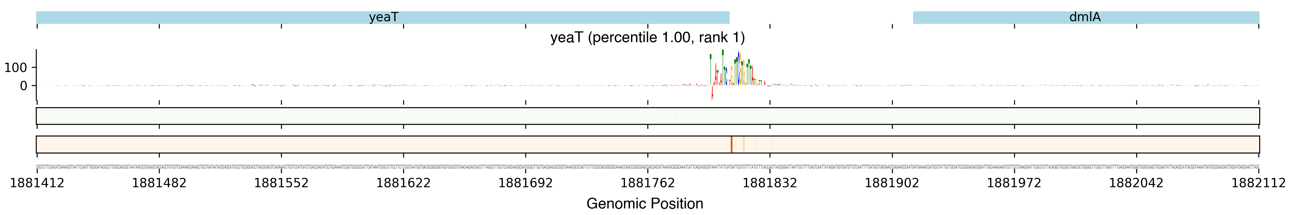 Top row shows gene annotations. Each set of panels beneath the annotation row shows the predictions for one TF. The sequence logo shows the contribution of the base at each position to the overall binding affinity, with bases above the horizontal axis contributing positive binding affinity and bases below contributing negative binding affinity. The heatmaps below the sequence logos show the exponentiated binding score at each position (the exponentiated score of the weight matrix and bias at that position). The top heatmap in green shows hits on the positive strand, and the bottom heatmap in red shows hits on the negative strand.