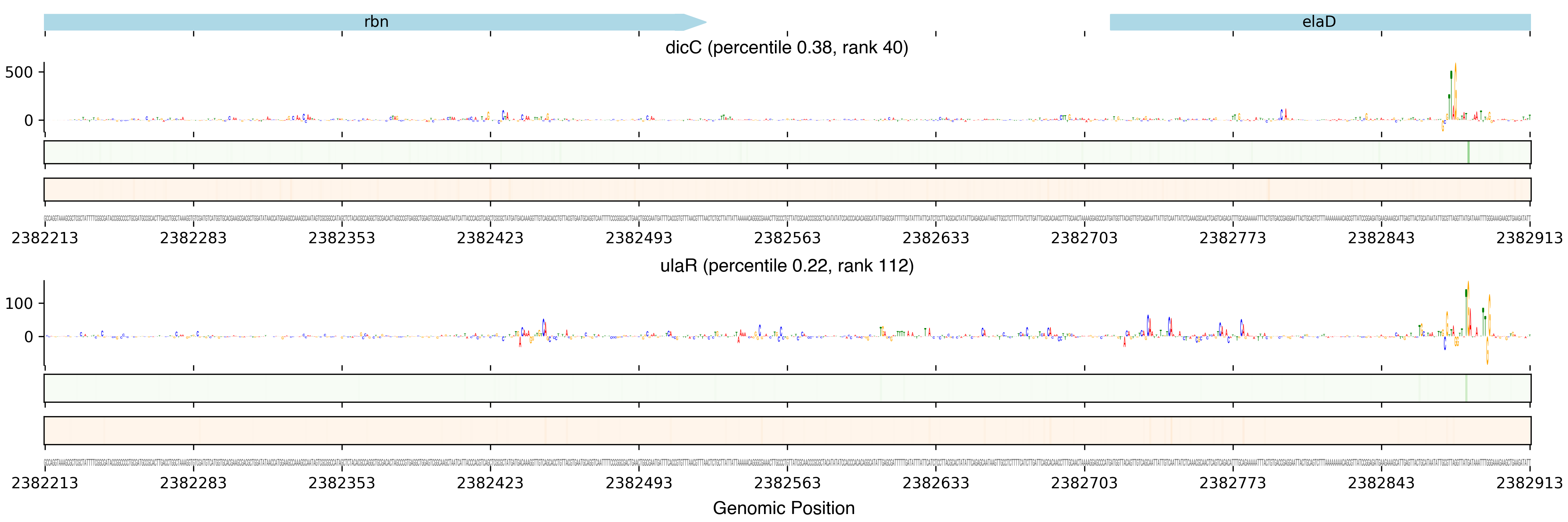 Top row shows gene annotations. Each set of panels beneath the annotation row shows the predictions for one TF. The sequence logo shows the contribution of the base at each position to the overall binding affinity, with bases above the horizontal axis contributing positive binding affinity and bases below contributing negative binding affinity. The heatmaps below the sequence logos show the exponentiated binding score at each position (the exponentiated score of the weight matrix and bias at that position). The top heatmap in green shows hits on the positive strand, and the bottom heatmap in red shows hits on the negative strand.
