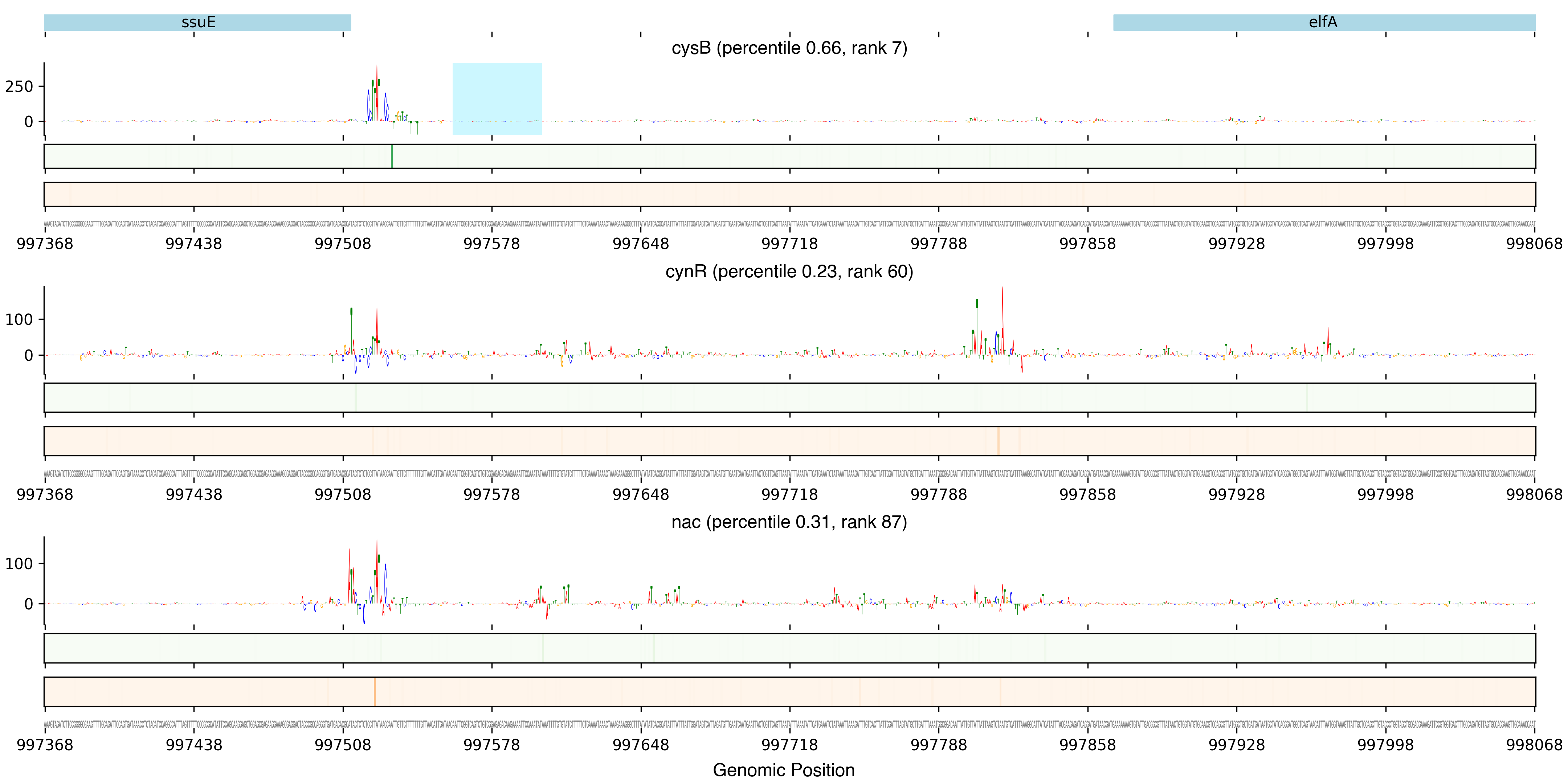 Top row shows gene annotations. Each set of panels beneath the annotation row shows the predictions for one TF. The sequence logo shows the contribution of the base at each position to the overall binding affinity, with bases above the horizontal axis contributing positive binding affinity and bases below contributing negative binding affinity. The heatmaps below the sequence logos show the exponentiated binding score at each position (the exponentiated score of the weight matrix and bias at that position). The top heatmap in green shows hits on the positive strand, and the bottom heatmap in red shows hits on the negative strand.