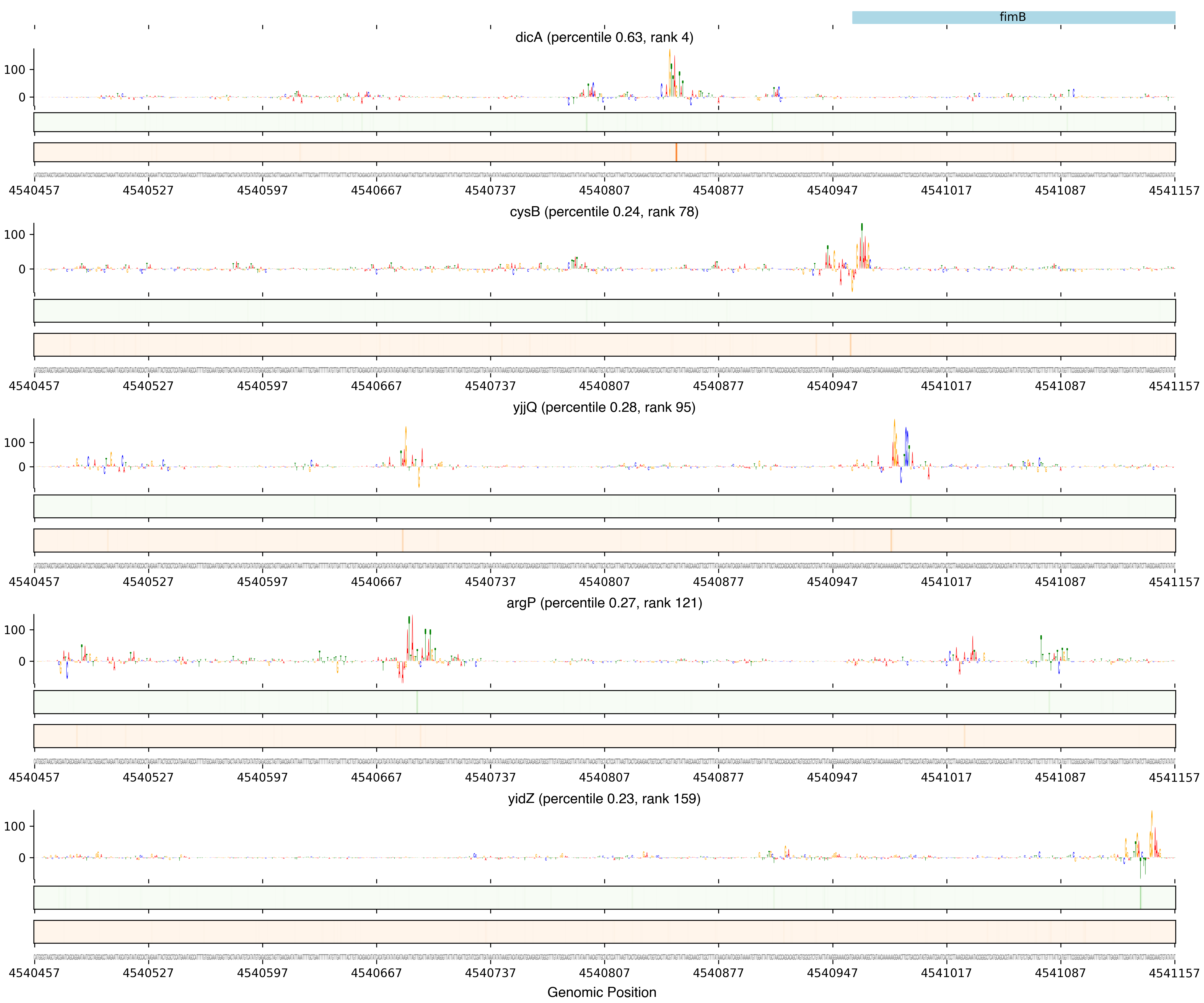Top row shows gene annotations. Each set of panels beneath the annotation row shows the predictions for one TF. The sequence logo shows the contribution of the base at each position to the overall binding affinity, with bases above the horizontal axis contributing positive binding affinity and bases below contributing negative binding affinity. The heatmaps below the sequence logos show the exponentiated binding score at each position (the exponentiated score of the weight matrix and bias at that position). The top heatmap in green shows hits on the positive strand, and the bottom heatmap in red shows hits on the negative strand.