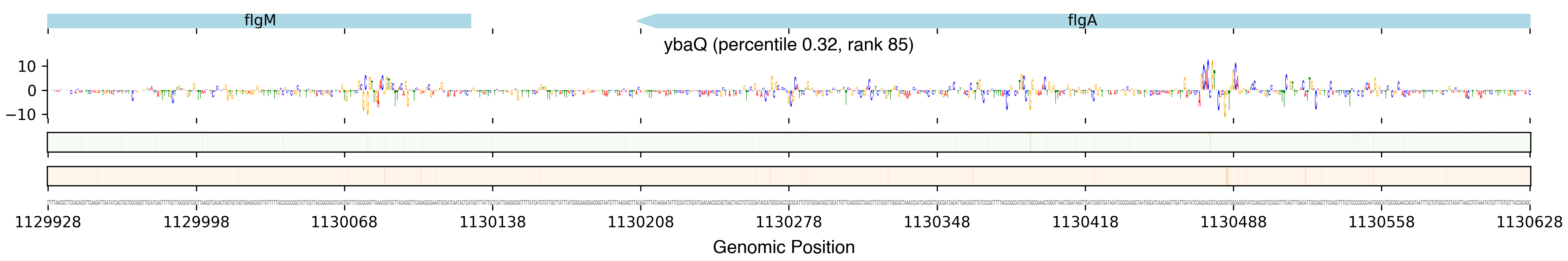 Top row shows gene annotations. Each set of panels beneath the annotation row shows the predictions for one TF. The sequence logo shows the contribution of the base at each position to the overall binding affinity, with bases above the horizontal axis contributing positive binding affinity and bases below contributing negative binding affinity. The heatmaps below the sequence logos show the exponentiated binding score at each position (the exponentiated score of the weight matrix and bias at that position). The top heatmap in green shows hits on the positive strand, and the bottom heatmap in red shows hits on the negative strand.