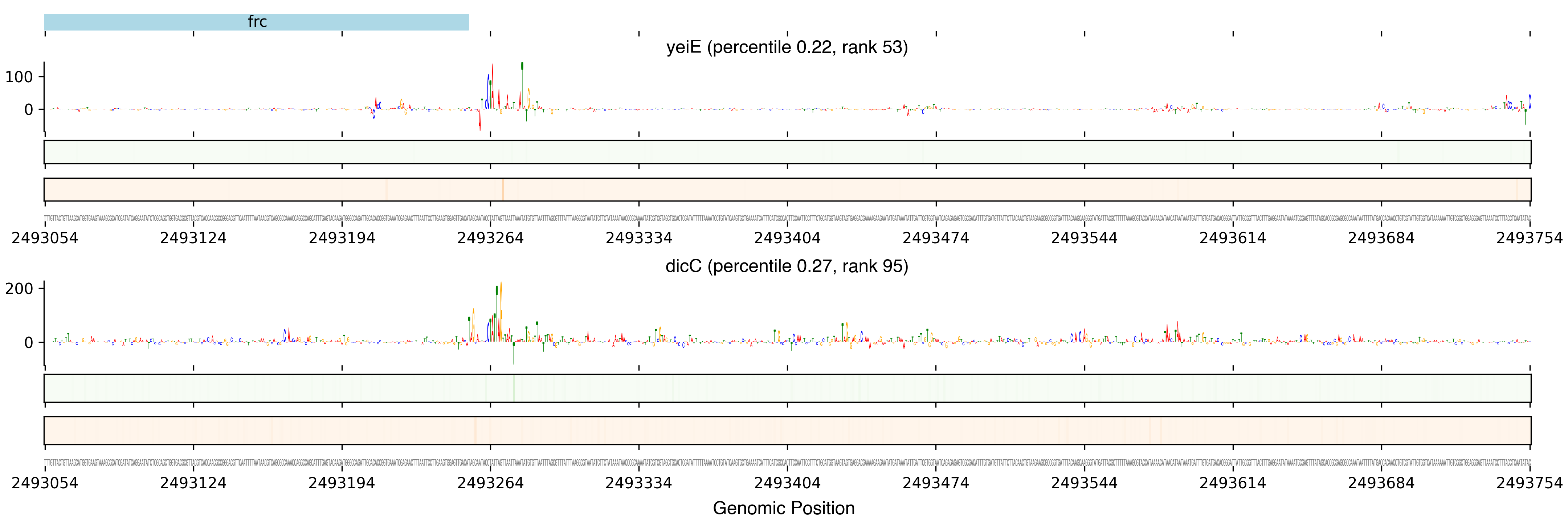 Top row shows gene annotations. Each set of panels beneath the annotation row shows the predictions for one TF. The sequence logo shows the contribution of the base at each position to the overall binding affinity, with bases above the horizontal axis contributing positive binding affinity and bases below contributing negative binding affinity. The heatmaps below the sequence logos show the exponentiated binding score at each position (the exponentiated score of the weight matrix and bias at that position). The top heatmap in green shows hits on the positive strand, and the bottom heatmap in red shows hits on the negative strand.