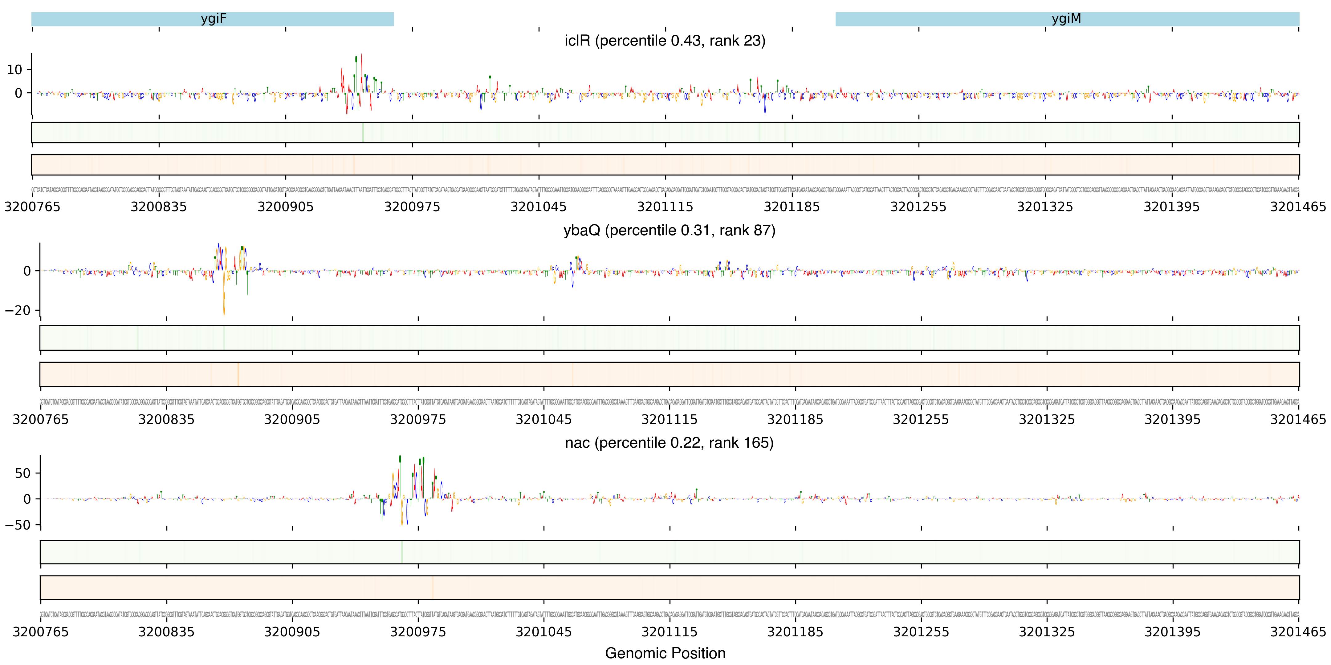 Top row shows gene annotations. Each set of panels beneath the annotation row shows the predictions for one TF. The sequence logo shows the contribution of the base at each position to the overall binding affinity, with bases above the horizontal axis contributing positive binding affinity and bases below contributing negative binding affinity. The heatmaps below the sequence logos show the exponentiated binding score at each position (the exponentiated score of the weight matrix and bias at that position). The top heatmap in green shows hits on the positive strand, and the bottom heatmap in red shows hits on the negative strand.