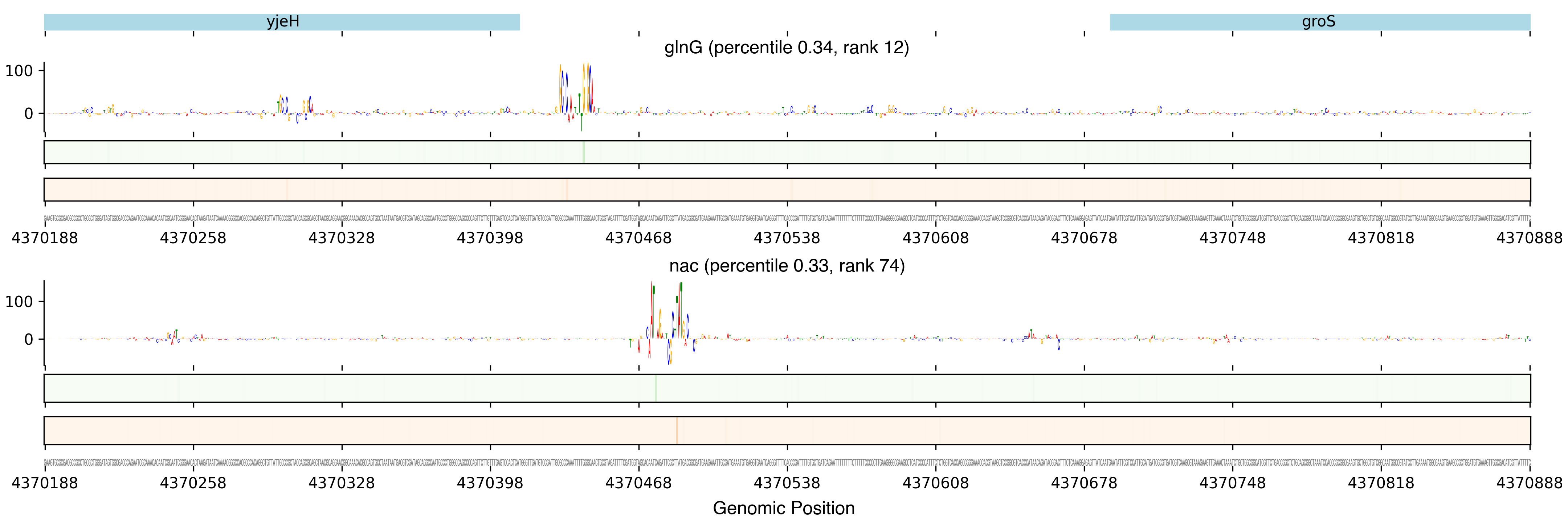 Top row shows gene annotations. Each set of panels beneath the annotation row shows the predictions for one TF. The sequence logo shows the contribution of the base at each position to the overall binding affinity, with bases above the horizontal axis contributing positive binding affinity and bases below contributing negative binding affinity. The heatmaps below the sequence logos show the exponentiated binding score at each position (the exponentiated score of the weight matrix and bias at that position). The top heatmap in green shows hits on the positive strand, and the bottom heatmap in red shows hits on the negative strand.