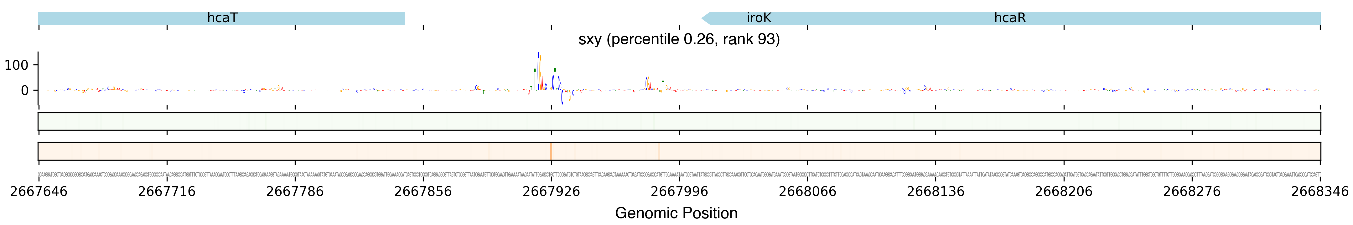 Top row shows gene annotations. Each set of panels beneath the annotation row shows the predictions for one TF. The sequence logo shows the contribution of the base at each position to the overall binding affinity, with bases above the horizontal axis contributing positive binding affinity and bases below contributing negative binding affinity. The heatmaps below the sequence logos show the exponentiated binding score at each position (the exponentiated score of the weight matrix and bias at that position). The top heatmap in green shows hits on the positive strand, and the bottom heatmap in red shows hits on the negative strand.