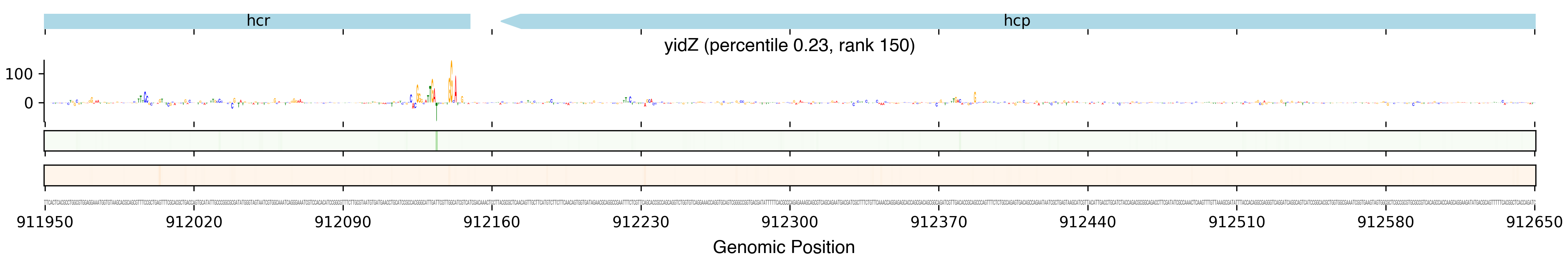Top row shows gene annotations. Each set of panels beneath the annotation row shows the predictions for one TF. The sequence logo shows the contribution of the base at each position to the overall binding affinity, with bases above the horizontal axis contributing positive binding affinity and bases below contributing negative binding affinity. The heatmaps below the sequence logos show the exponentiated binding score at each position (the exponentiated score of the weight matrix and bias at that position). The top heatmap in green shows hits on the positive strand, and the bottom heatmap in red shows hits on the negative strand.