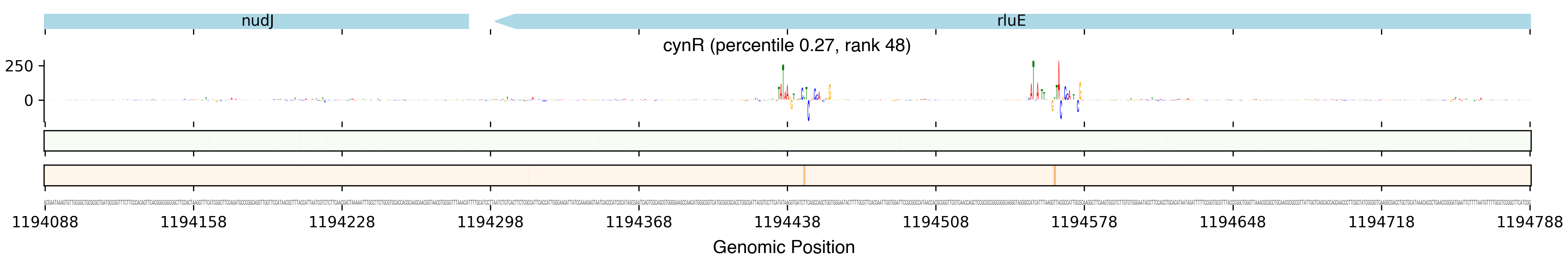 Top row shows gene annotations. Each set of panels beneath the annotation row shows the predictions for one TF. The sequence logo shows the contribution of the base at each position to the overall binding affinity, with bases above the horizontal axis contributing positive binding affinity and bases below contributing negative binding affinity. The heatmaps below the sequence logos show the exponentiated binding score at each position (the exponentiated score of the weight matrix and bias at that position). The top heatmap in green shows hits on the positive strand, and the bottom heatmap in red shows hits on the negative strand.