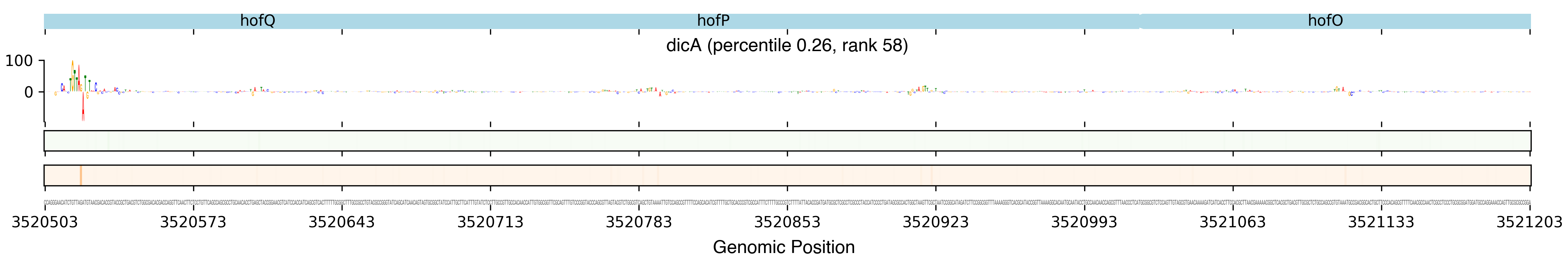 Top row shows gene annotations. Each set of panels beneath the annotation row shows the predictions for one TF. The sequence logo shows the contribution of the base at each position to the overall binding affinity, with bases above the horizontal axis contributing positive binding affinity and bases below contributing negative binding affinity. The heatmaps below the sequence logos show the exponentiated binding score at each position (the exponentiated score of the weight matrix and bias at that position). The top heatmap in green shows hits on the positive strand, and the bottom heatmap in red shows hits on the negative strand.