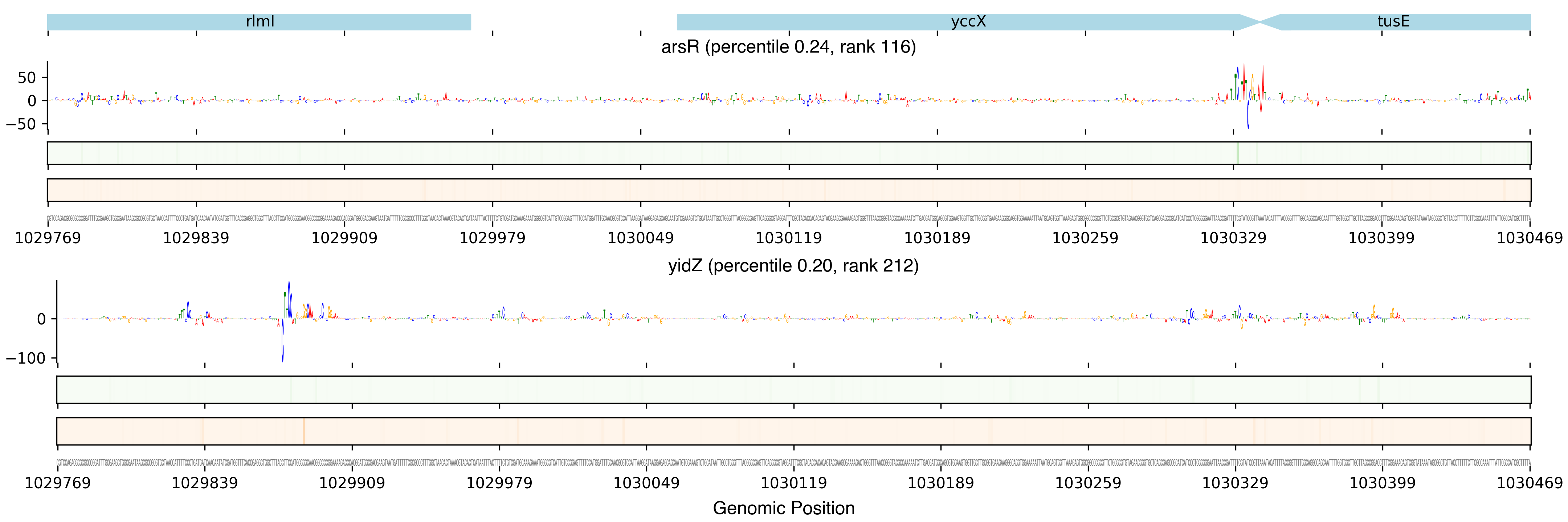 Top row shows gene annotations. Each set of panels beneath the annotation row shows the predictions for one TF. The sequence logo shows the contribution of the base at each position to the overall binding affinity, with bases above the horizontal axis contributing positive binding affinity and bases below contributing negative binding affinity. The heatmaps below the sequence logos show the exponentiated binding score at each position (the exponentiated score of the weight matrix and bias at that position). The top heatmap in green shows hits on the positive strand, and the bottom heatmap in red shows hits on the negative strand.