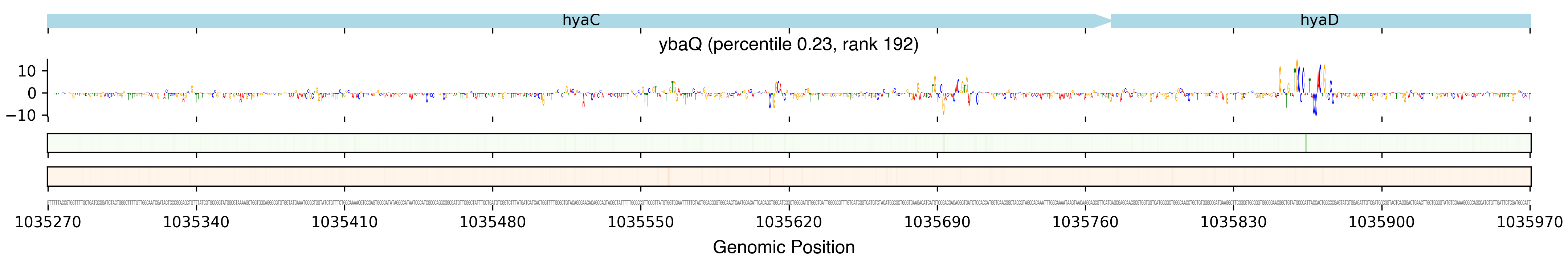 Top row shows gene annotations. Each set of panels beneath the annotation row shows the predictions for one TF. The sequence logo shows the contribution of the base at each position to the overall binding affinity, with bases above the horizontal axis contributing positive binding affinity and bases below contributing negative binding affinity. The heatmaps below the sequence logos show the exponentiated binding score at each position (the exponentiated score of the weight matrix and bias at that position). The top heatmap in green shows hits on the positive strand, and the bottom heatmap in red shows hits on the negative strand.