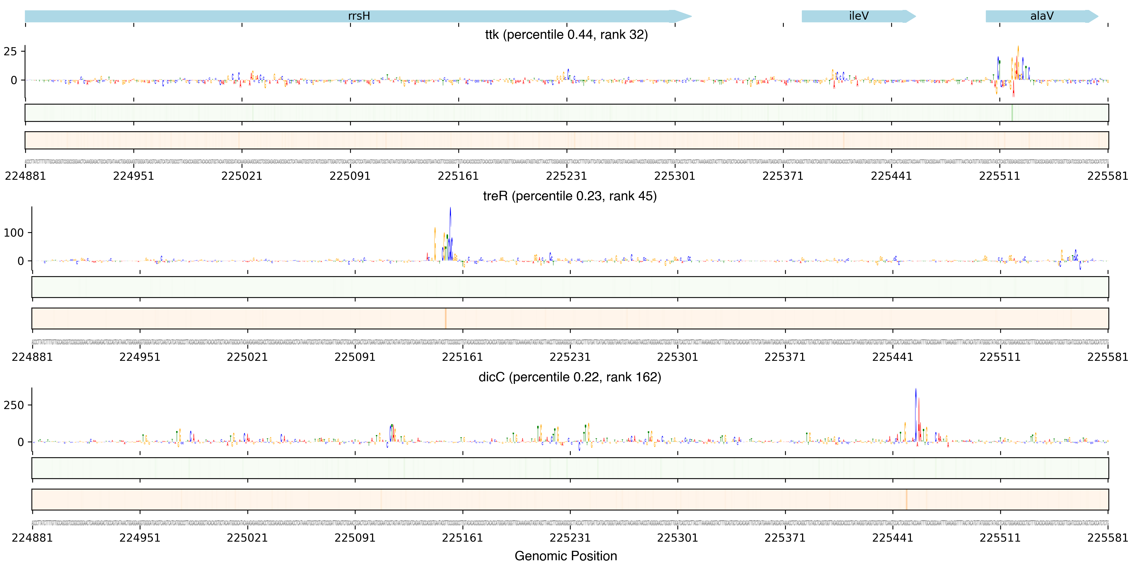 Top row shows gene annotations. Each set of panels beneath the annotation row shows the predictions for one TF. The sequence logo shows the contribution of the base at each position to the overall binding affinity, with bases above the horizontal axis contributing positive binding affinity and bases below contributing negative binding affinity. The heatmaps below the sequence logos show the exponentiated binding score at each position (the exponentiated score of the weight matrix and bias at that position). The top heatmap in green shows hits on the positive strand, and the bottom heatmap in red shows hits on the negative strand.