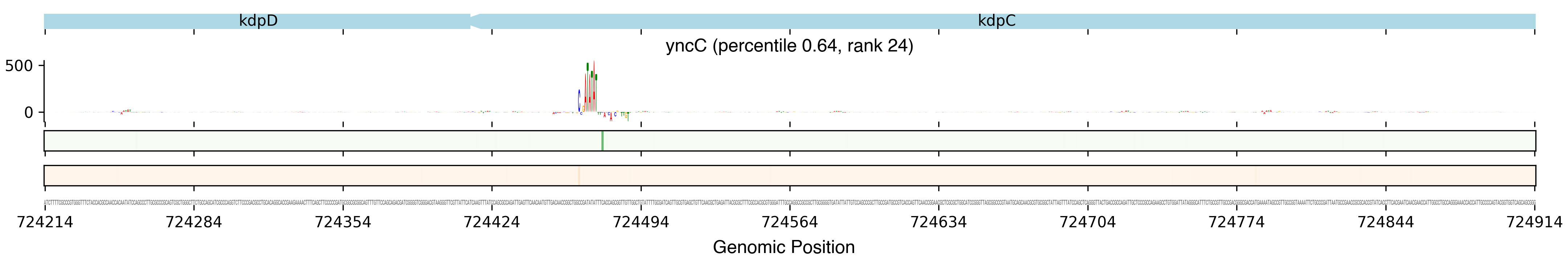 Top row shows gene annotations. Each set of panels beneath the annotation row shows the predictions for one TF. The sequence logo shows the contribution of the base at each position to the overall binding affinity, with bases above the horizontal axis contributing positive binding affinity and bases below contributing negative binding affinity. The heatmaps below the sequence logos show the exponentiated binding score at each position (the exponentiated score of the weight matrix and bias at that position). The top heatmap in green shows hits on the positive strand, and the bottom heatmap in red shows hits on the negative strand.