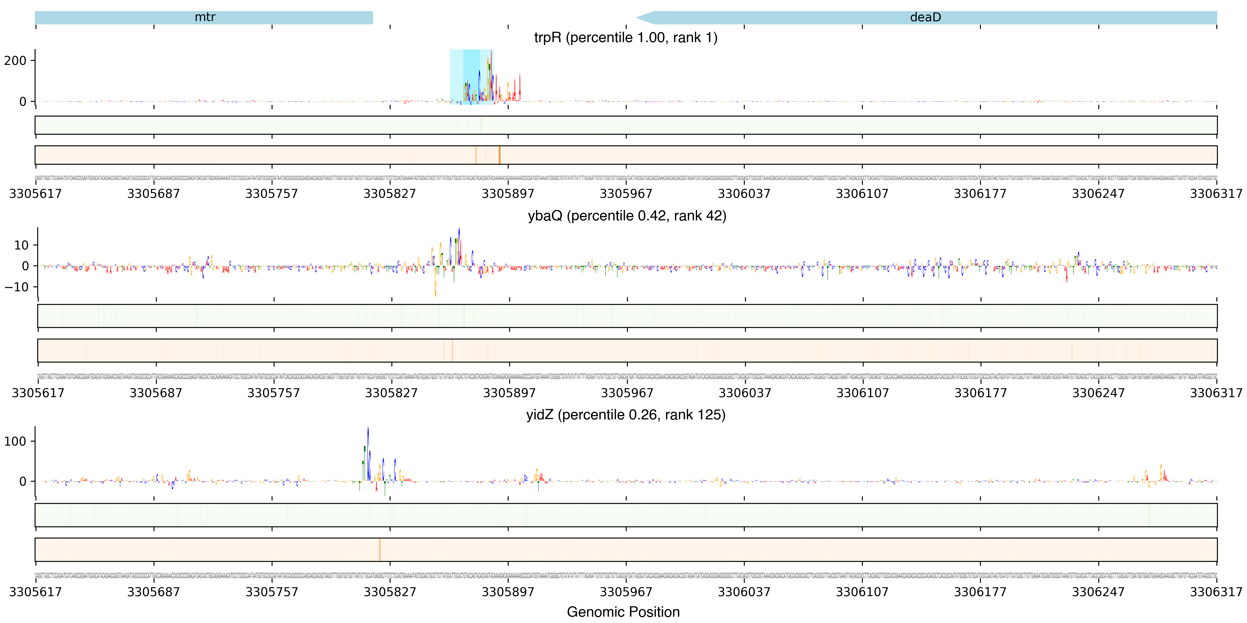 Top row shows gene annotations. Each set of panels beneath the annotation row shows the predictions for one TF. The sequence logo shows the contribution of the base at each position to the overall binding affinity, with bases above the horizontal axis contributing positive binding affinity and bases below contributing negative binding affinity. The heatmaps below the sequence logos show the exponentiated binding score at each position (the exponentiated score of the weight matrix and bias at that position). The top heatmap in green shows hits on the positive strand, and the bottom heatmap in red shows hits on the negative strand.