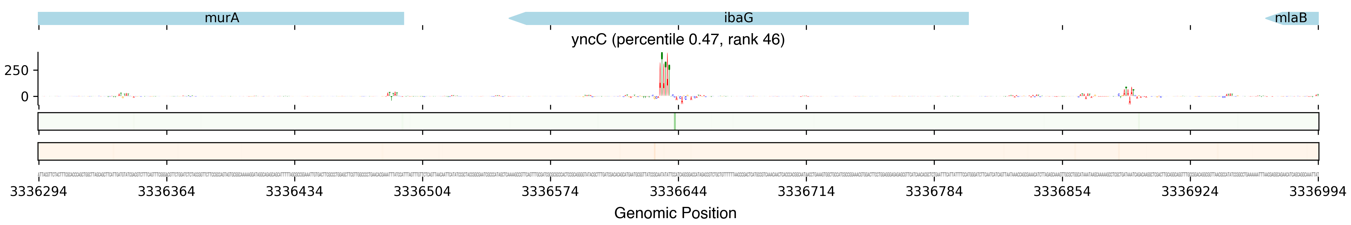 Top row shows gene annotations. Each set of panels beneath the annotation row shows the predictions for one TF. The sequence logo shows the contribution of the base at each position to the overall binding affinity, with bases above the horizontal axis contributing positive binding affinity and bases below contributing negative binding affinity. The heatmaps below the sequence logos show the exponentiated binding score at each position (the exponentiated score of the weight matrix and bias at that position). The top heatmap in green shows hits on the positive strand, and the bottom heatmap in red shows hits on the negative strand.