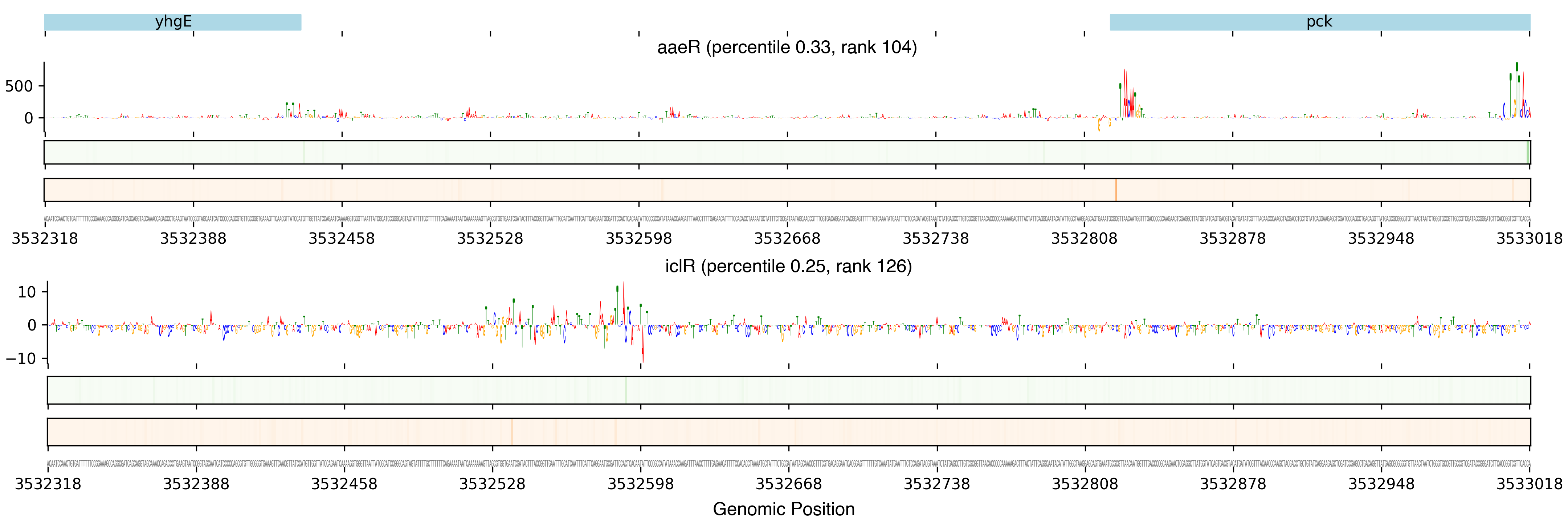 Top row shows gene annotations. Each set of panels beneath the annotation row shows the predictions for one TF. The sequence logo shows the contribution of the base at each position to the overall binding affinity, with bases above the horizontal axis contributing positive binding affinity and bases below contributing negative binding affinity. The heatmaps below the sequence logos show the exponentiated binding score at each position (the exponentiated score of the weight matrix and bias at that position). The top heatmap in green shows hits on the positive strand, and the bottom heatmap in red shows hits on the negative strand.