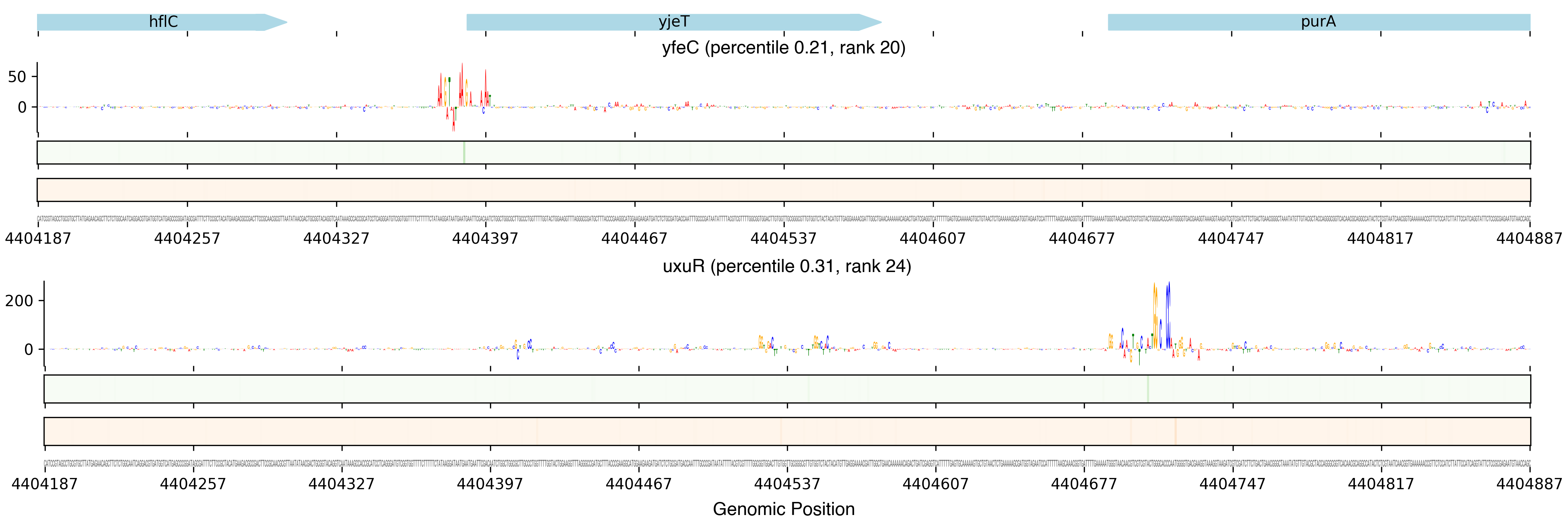 Top row shows gene annotations. Each set of panels beneath the annotation row shows the predictions for one TF. The sequence logo shows the contribution of the base at each position to the overall binding affinity, with bases above the horizontal axis contributing positive binding affinity and bases below contributing negative binding affinity. The heatmaps below the sequence logos show the exponentiated binding score at each position (the exponentiated score of the weight matrix and bias at that position). The top heatmap in green shows hits on the positive strand, and the bottom heatmap in red shows hits on the negative strand.