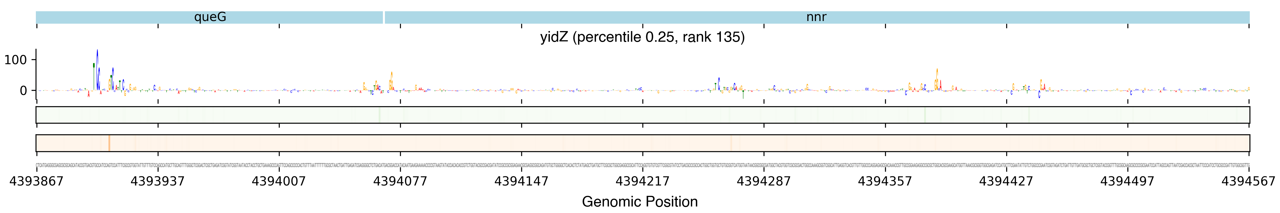 Top row shows gene annotations. Each set of panels beneath the annotation row shows the predictions for one TF. The sequence logo shows the contribution of the base at each position to the overall binding affinity, with bases above the horizontal axis contributing positive binding affinity and bases below contributing negative binding affinity. The heatmaps below the sequence logos show the exponentiated binding score at each position (the exponentiated score of the weight matrix and bias at that position). The top heatmap in green shows hits on the positive strand, and the bottom heatmap in red shows hits on the negative strand.