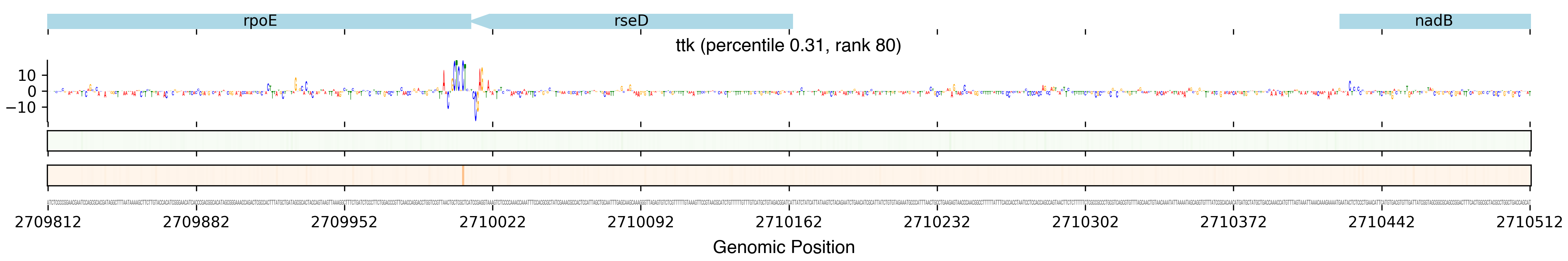 Top row shows gene annotations. Each set of panels beneath the annotation row shows the predictions for one TF. The sequence logo shows the contribution of the base at each position to the overall binding affinity, with bases above the horizontal axis contributing positive binding affinity and bases below contributing negative binding affinity. The heatmaps below the sequence logos show the exponentiated binding score at each position (the exponentiated score of the weight matrix and bias at that position). The top heatmap in green shows hits on the positive strand, and the bottom heatmap in red shows hits on the negative strand.