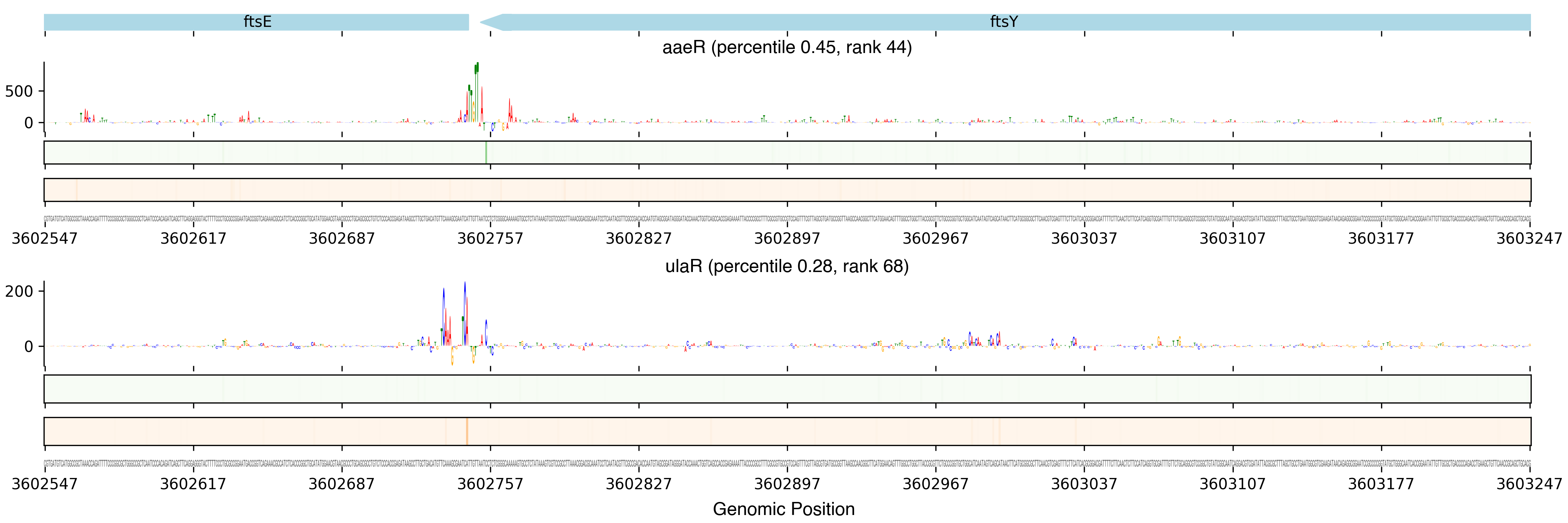 Top row shows gene annotations. Each set of panels beneath the annotation row shows the predictions for one TF. The sequence logo shows the contribution of the base at each position to the overall binding affinity, with bases above the horizontal axis contributing positive binding affinity and bases below contributing negative binding affinity. The heatmaps below the sequence logos show the exponentiated binding score at each position (the exponentiated score of the weight matrix and bias at that position). The top heatmap in green shows hits on the positive strand, and the bottom heatmap in red shows hits on the negative strand.