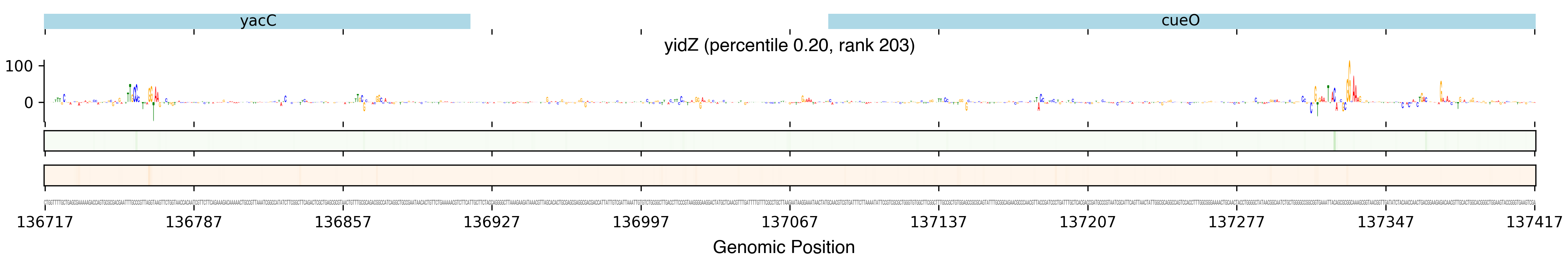Top row shows gene annotations. Each set of panels beneath the annotation row shows the predictions for one TF. The sequence logo shows the contribution of the base at each position to the overall binding affinity, with bases above the horizontal axis contributing positive binding affinity and bases below contributing negative binding affinity. The heatmaps below the sequence logos show the exponentiated binding score at each position (the exponentiated score of the weight matrix and bias at that position). The top heatmap in green shows hits on the positive strand, and the bottom heatmap in red shows hits on the negative strand.
