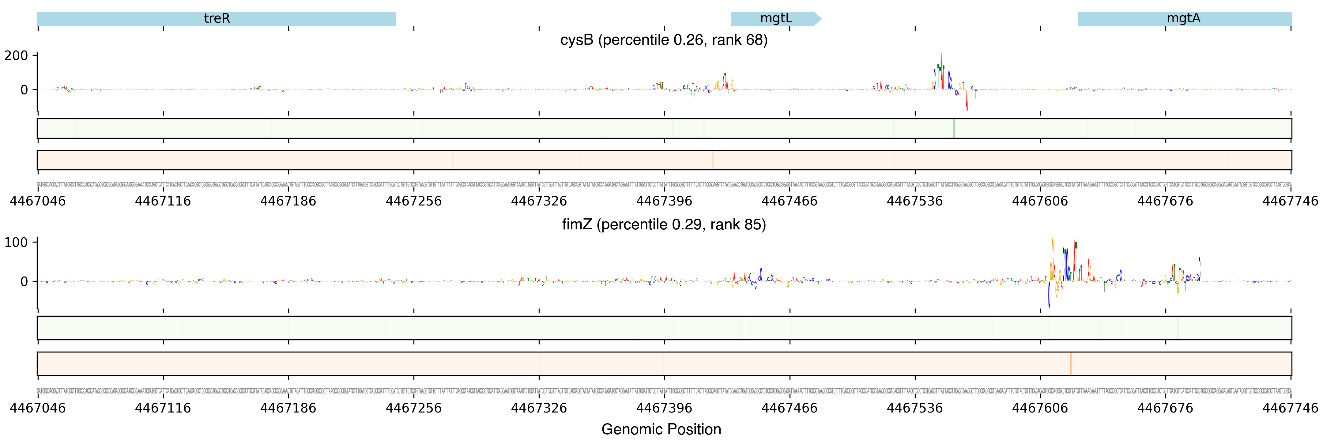 Top row shows gene annotations. Each set of panels beneath the annotation row shows the predictions for one TF. The sequence logo shows the contribution of the base at each position to the overall binding affinity, with bases above the horizontal axis contributing positive binding affinity and bases below contributing negative binding affinity. The heatmaps below the sequence logos show the exponentiated binding score at each position (the exponentiated score of the weight matrix and bias at that position). The top heatmap in green shows hits on the positive strand, and the bottom heatmap in red shows hits on the negative strand.