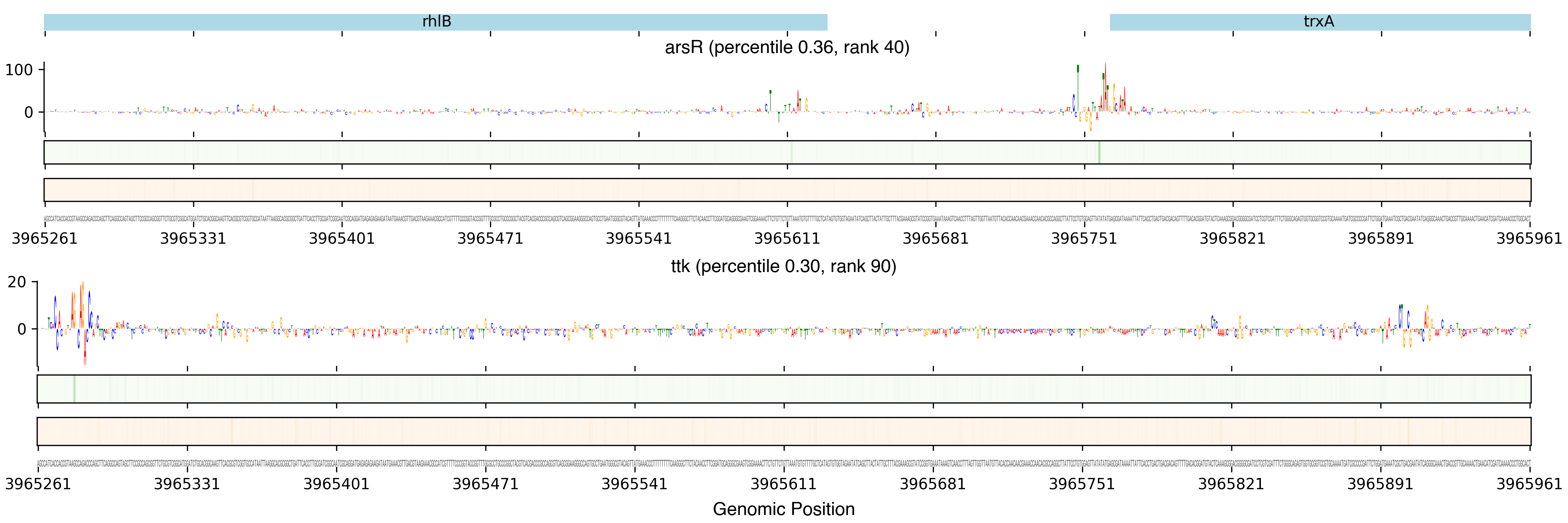Top row shows gene annotations. Each set of panels beneath the annotation row shows the predictions for one TF. The sequence logo shows the contribution of the base at each position to the overall binding affinity, with bases above the horizontal axis contributing positive binding affinity and bases below contributing negative binding affinity. The heatmaps below the sequence logos show the exponentiated binding score at each position (the exponentiated score of the weight matrix and bias at that position). The top heatmap in green shows hits on the positive strand, and the bottom heatmap in red shows hits on the negative strand.