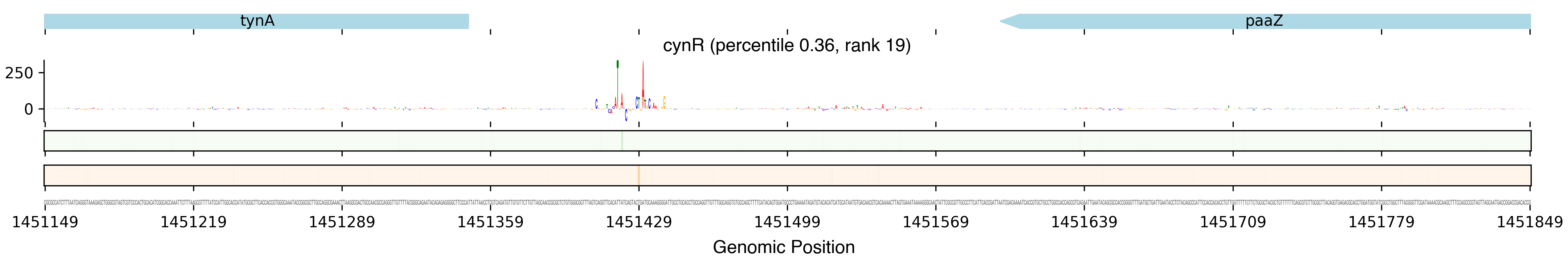 Top row shows gene annotations. Each set of panels beneath the annotation row shows the predictions for one TF. The sequence logo shows the contribution of the base at each position to the overall binding affinity, with bases above the horizontal axis contributing positive binding affinity and bases below contributing negative binding affinity. The heatmaps below the sequence logos show the exponentiated binding score at each position (the exponentiated score of the weight matrix and bias at that position). The top heatmap in green shows hits on the positive strand, and the bottom heatmap in red shows hits on the negative strand.