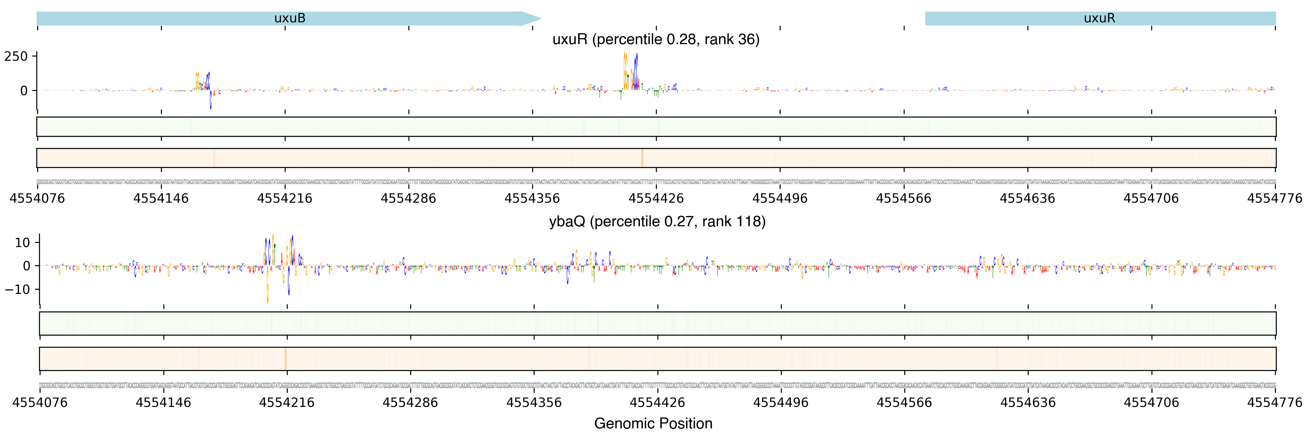 Top row shows gene annotations. Each set of panels beneath the annotation row shows the predictions for one TF. The sequence logo shows the contribution of the base at each position to the overall binding affinity, with bases above the horizontal axis contributing positive binding affinity and bases below contributing negative binding affinity. The heatmaps below the sequence logos show the exponentiated binding score at each position (the exponentiated score of the weight matrix and bias at that position). The top heatmap in green shows hits on the positive strand, and the bottom heatmap in red shows hits on the negative strand.