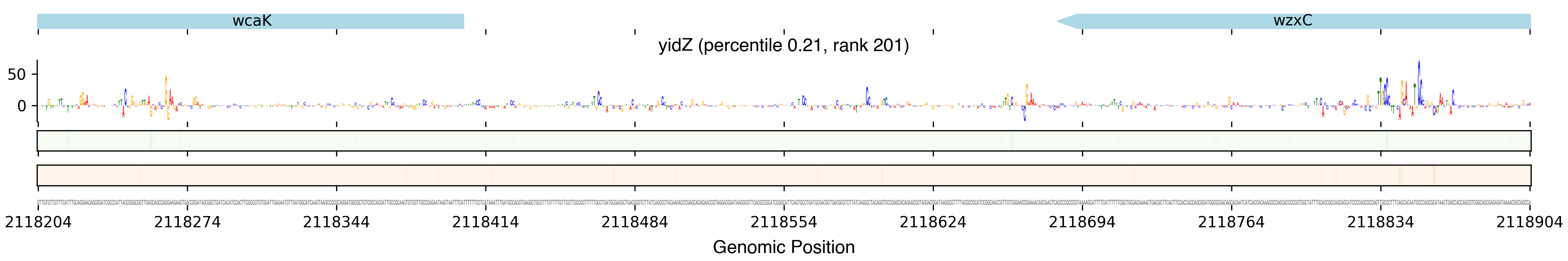 Top row shows gene annotations. Each set of panels beneath the annotation row shows the predictions for one TF. The sequence logo shows the contribution of the base at each position to the overall binding affinity, with bases above the horizontal axis contributing positive binding affinity and bases below contributing negative binding affinity. The heatmaps below the sequence logos show the exponentiated binding score at each position (the exponentiated score of the weight matrix and bias at that position). The top heatmap in green shows hits on the positive strand, and the bottom heatmap in red shows hits on the negative strand.