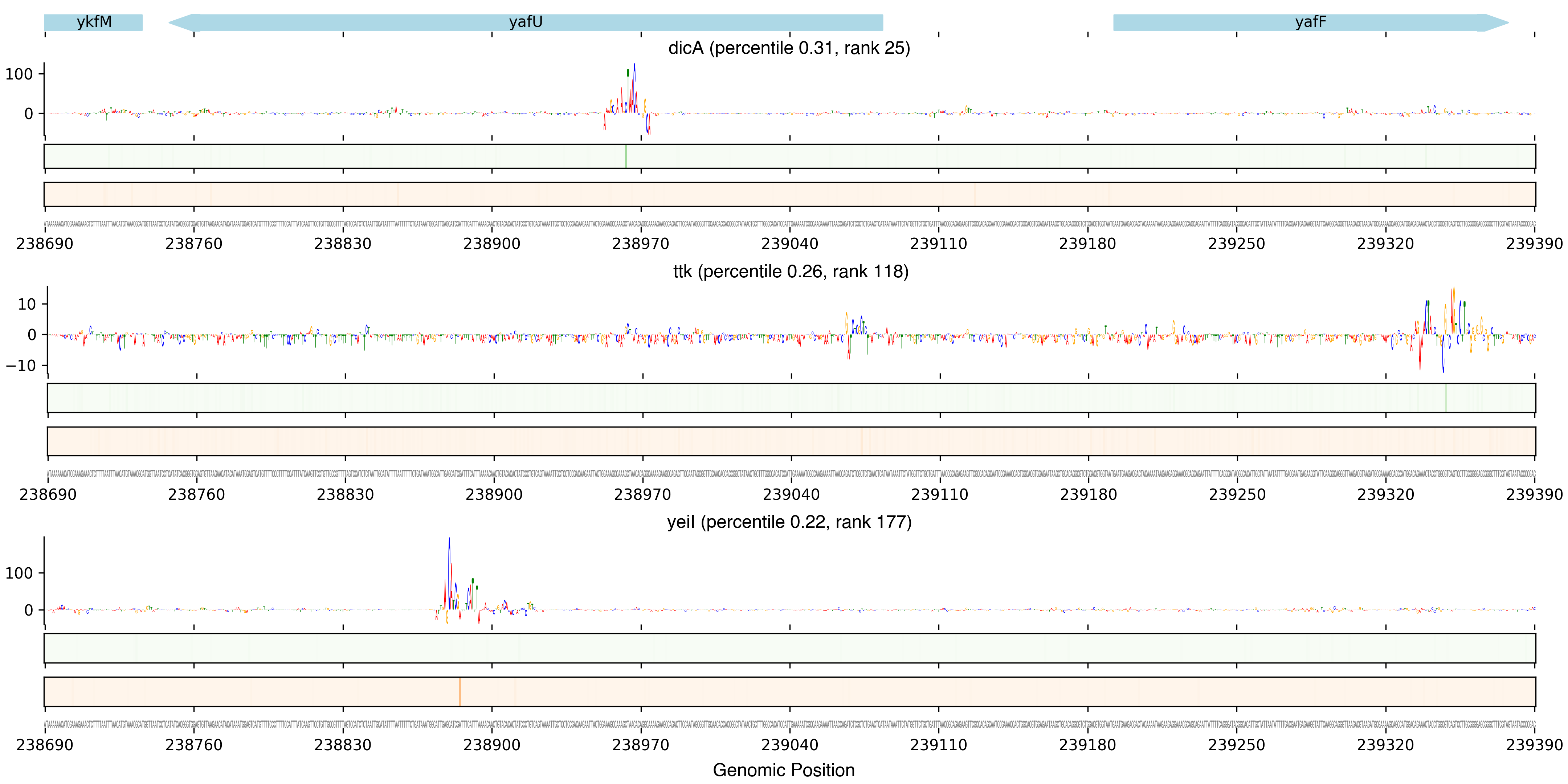 Top row shows gene annotations. Each set of panels beneath the annotation row shows the predictions for one TF. The sequence logo shows the contribution of the base at each position to the overall binding affinity, with bases above the horizontal axis contributing positive binding affinity and bases below contributing negative binding affinity. The heatmaps below the sequence logos show the exponentiated binding score at each position (the exponentiated score of the weight matrix and bias at that position). The top heatmap in green shows hits on the positive strand, and the bottom heatmap in red shows hits on the negative strand.