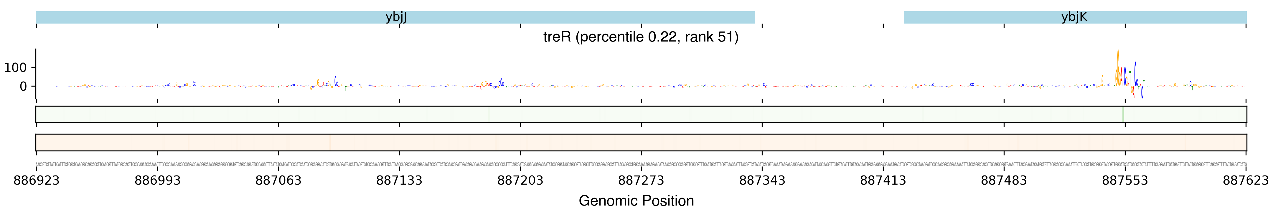 Top row shows gene annotations. Each set of panels beneath the annotation row shows the predictions for one TF. The sequence logo shows the contribution of the base at each position to the overall binding affinity, with bases above the horizontal axis contributing positive binding affinity and bases below contributing negative binding affinity. The heatmaps below the sequence logos show the exponentiated binding score at each position (the exponentiated score of the weight matrix and bias at that position). The top heatmap in green shows hits on the positive strand, and the bottom heatmap in red shows hits on the negative strand.