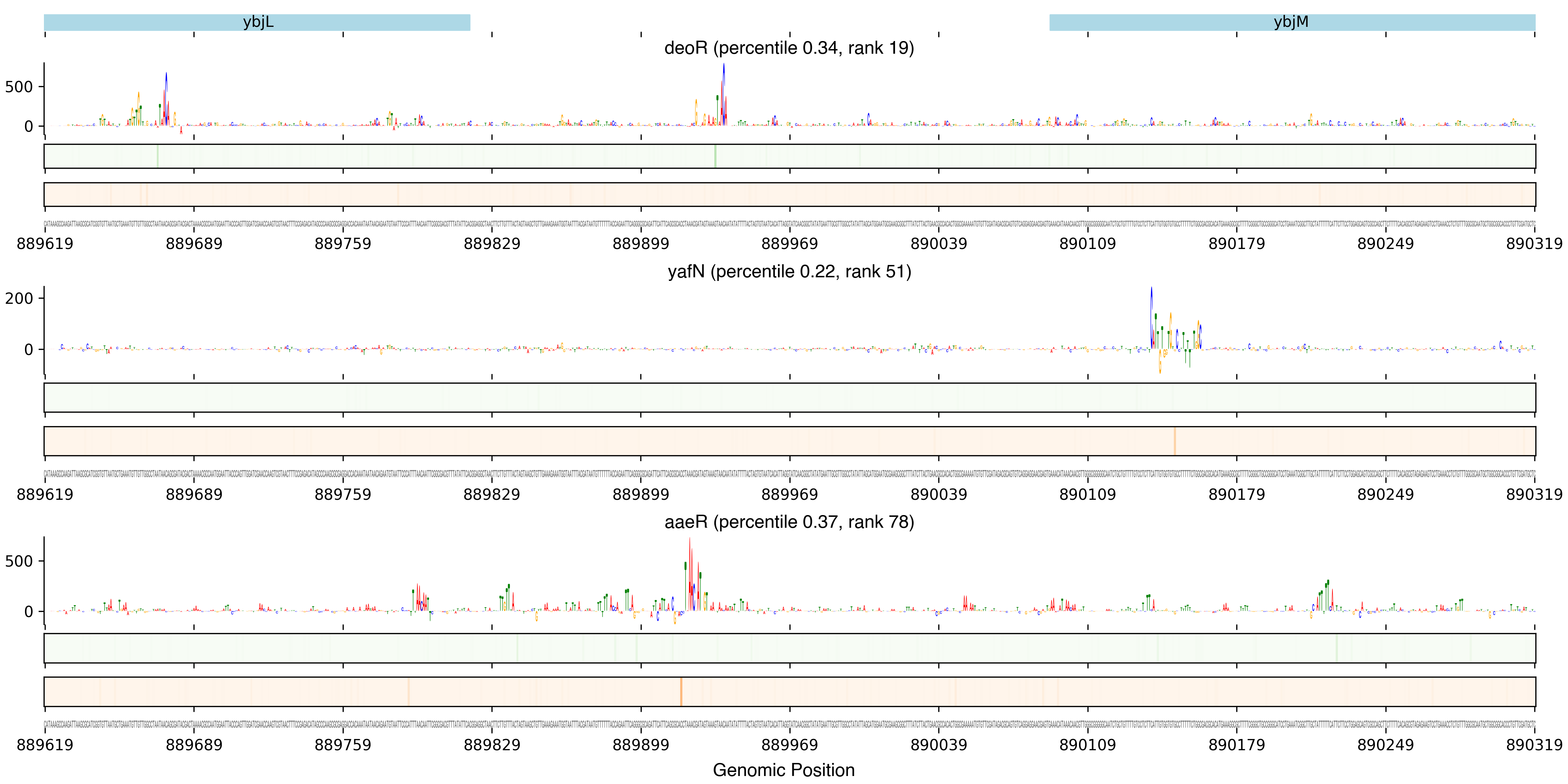 Top row shows gene annotations. Each set of panels beneath the annotation row shows the predictions for one TF. The sequence logo shows the contribution of the base at each position to the overall binding affinity, with bases above the horizontal axis contributing positive binding affinity and bases below contributing negative binding affinity. The heatmaps below the sequence logos show the exponentiated binding score at each position (the exponentiated score of the weight matrix and bias at that position). The top heatmap in green shows hits on the positive strand, and the bottom heatmap in red shows hits on the negative strand.