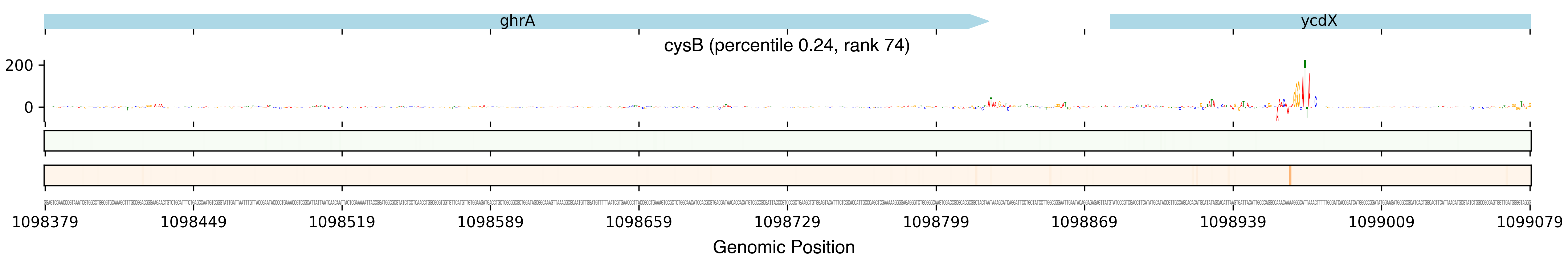 Top row shows gene annotations. Each set of panels beneath the annotation row shows the predictions for one TF. The sequence logo shows the contribution of the base at each position to the overall binding affinity, with bases above the horizontal axis contributing positive binding affinity and bases below contributing negative binding affinity. The heatmaps below the sequence logos show the exponentiated binding score at each position (the exponentiated score of the weight matrix and bias at that position). The top heatmap in green shows hits on the positive strand, and the bottom heatmap in red shows hits on the negative strand.