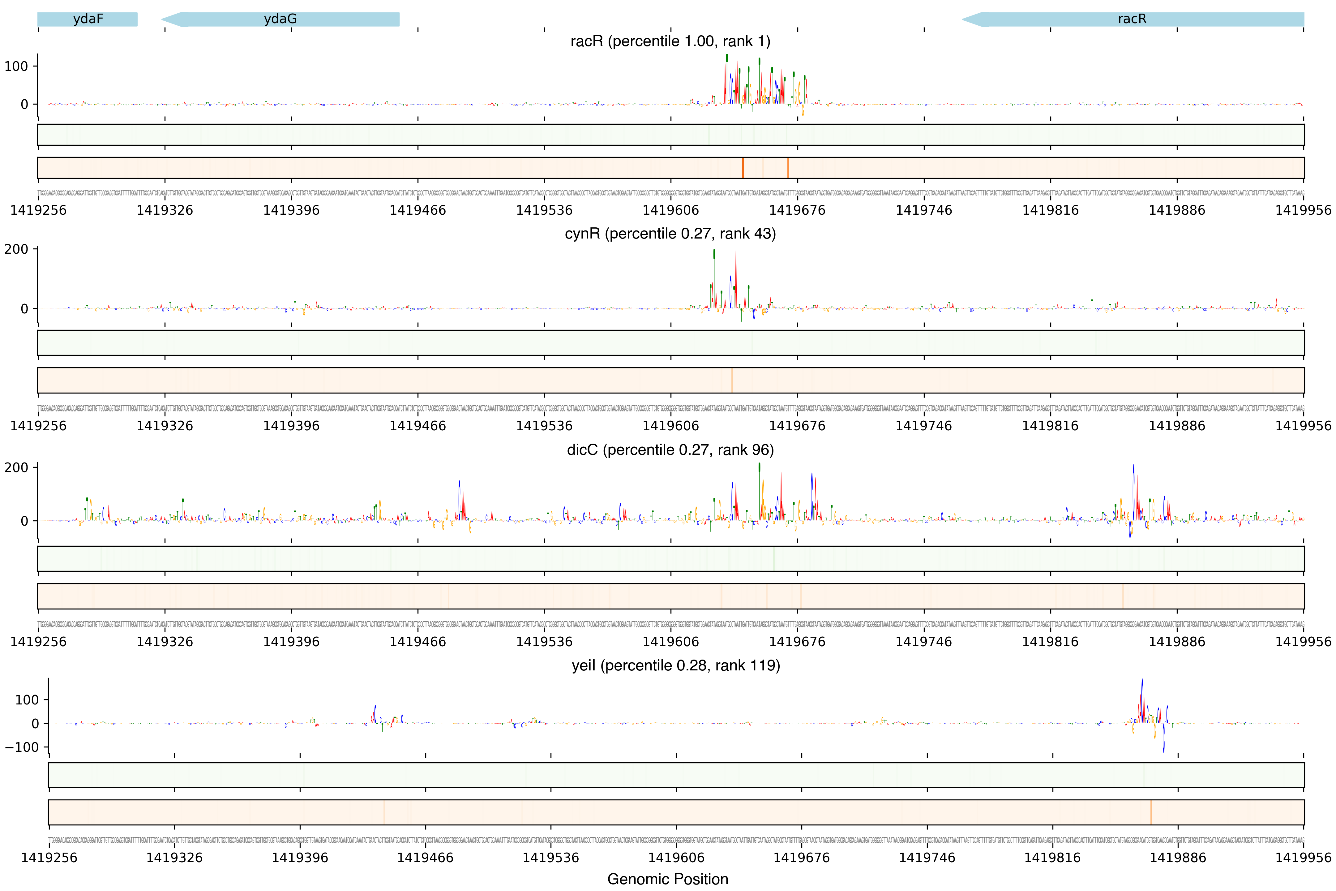 Top row shows gene annotations. Each set of panels beneath the annotation row shows the predictions for one TF. The sequence logo shows the contribution of the base at each position to the overall binding affinity, with bases above the horizontal axis contributing positive binding affinity and bases below contributing negative binding affinity. The heatmaps below the sequence logos show the exponentiated binding score at each position (the exponentiated score of the weight matrix and bias at that position). The top heatmap in green shows hits on the positive strand, and the bottom heatmap in red shows hits on the negative strand.