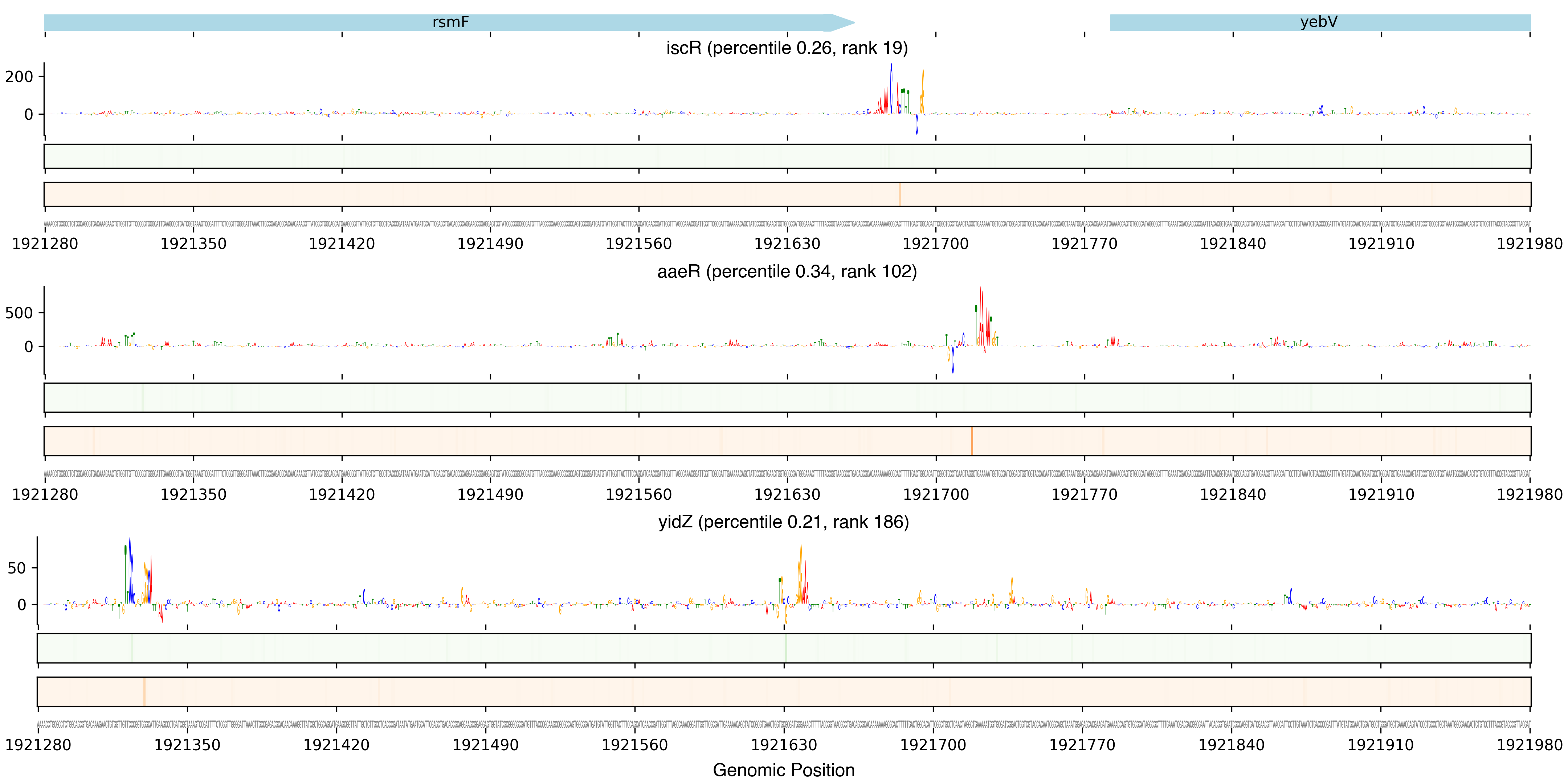 Top row shows gene annotations. Each set of panels beneath the annotation row shows the predictions for one TF. The sequence logo shows the contribution of the base at each position to the overall binding affinity, with bases above the horizontal axis contributing positive binding affinity and bases below contributing negative binding affinity. The heatmaps below the sequence logos show the exponentiated binding score at each position (the exponentiated score of the weight matrix and bias at that position). The top heatmap in green shows hits on the positive strand, and the bottom heatmap in red shows hits on the negative strand.