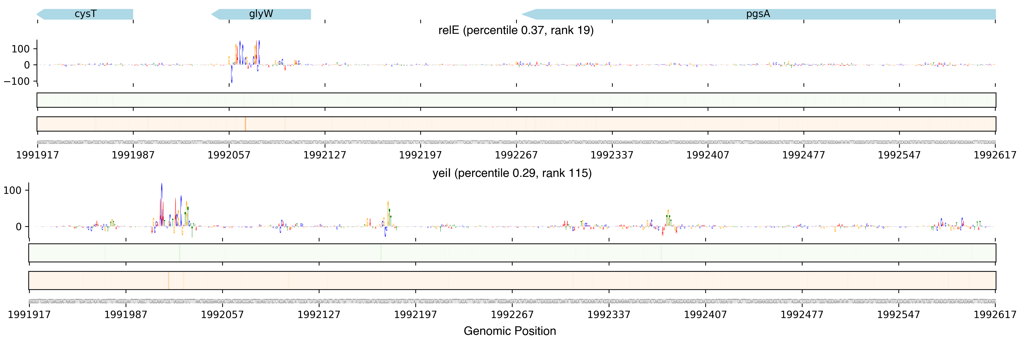 Top row shows gene annotations. Each set of panels beneath the annotation row shows the predictions for one TF. The sequence logo shows the contribution of the base at each position to the overall binding affinity, with bases above the horizontal axis contributing positive binding affinity and bases below contributing negative binding affinity. The heatmaps below the sequence logos show the exponentiated binding score at each position (the exponentiated score of the weight matrix and bias at that position). The top heatmap in green shows hits on the positive strand, and the bottom heatmap in red shows hits on the negative strand.
