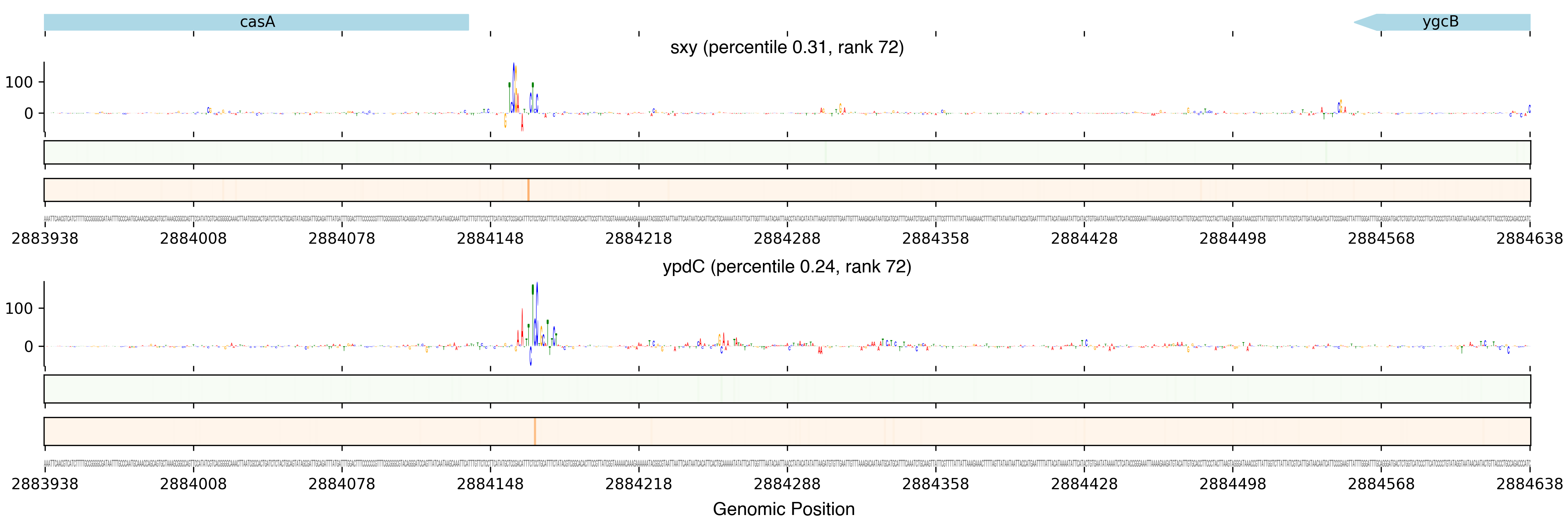 Top row shows gene annotations. Each set of panels beneath the annotation row shows the predictions for one TF. The sequence logo shows the contribution of the base at each position to the overall binding affinity, with bases above the horizontal axis contributing positive binding affinity and bases below contributing negative binding affinity. The heatmaps below the sequence logos show the exponentiated binding score at each position (the exponentiated score of the weight matrix and bias at that position). The top heatmap in green shows hits on the positive strand, and the bottom heatmap in red shows hits on the negative strand.