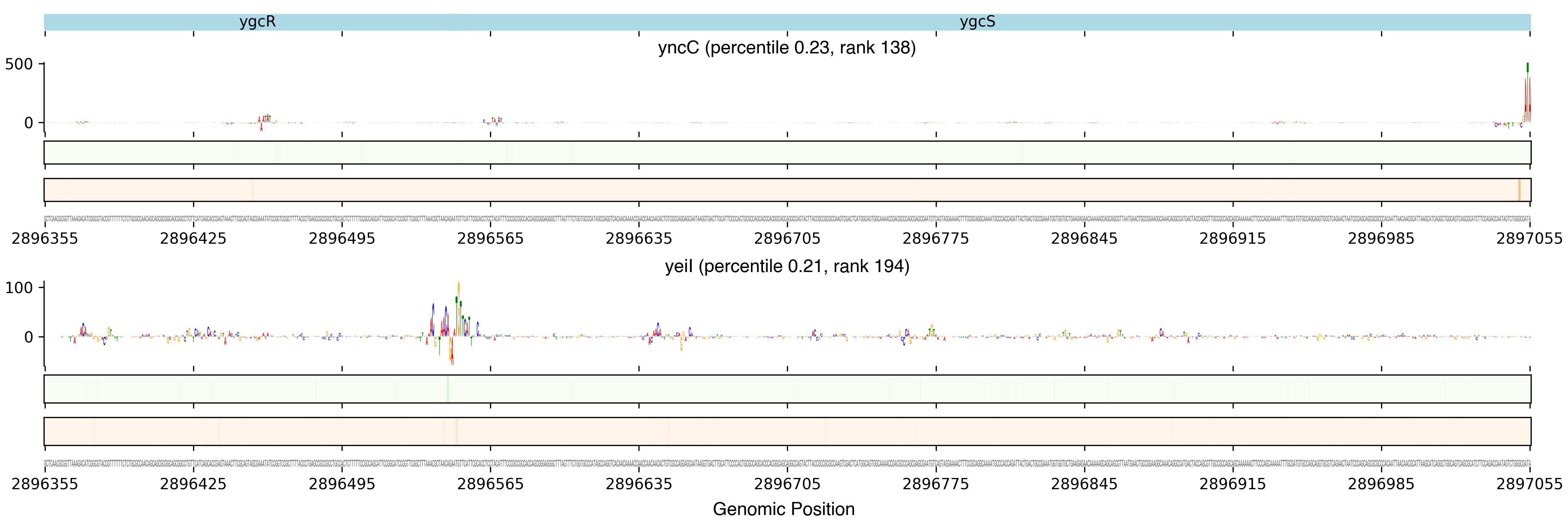 Top row shows gene annotations. Each set of panels beneath the annotation row shows the predictions for one TF. The sequence logo shows the contribution of the base at each position to the overall binding affinity, with bases above the horizontal axis contributing positive binding affinity and bases below contributing negative binding affinity. The heatmaps below the sequence logos show the exponentiated binding score at each position (the exponentiated score of the weight matrix and bias at that position). The top heatmap in green shows hits on the positive strand, and the bottom heatmap in red shows hits on the negative strand.