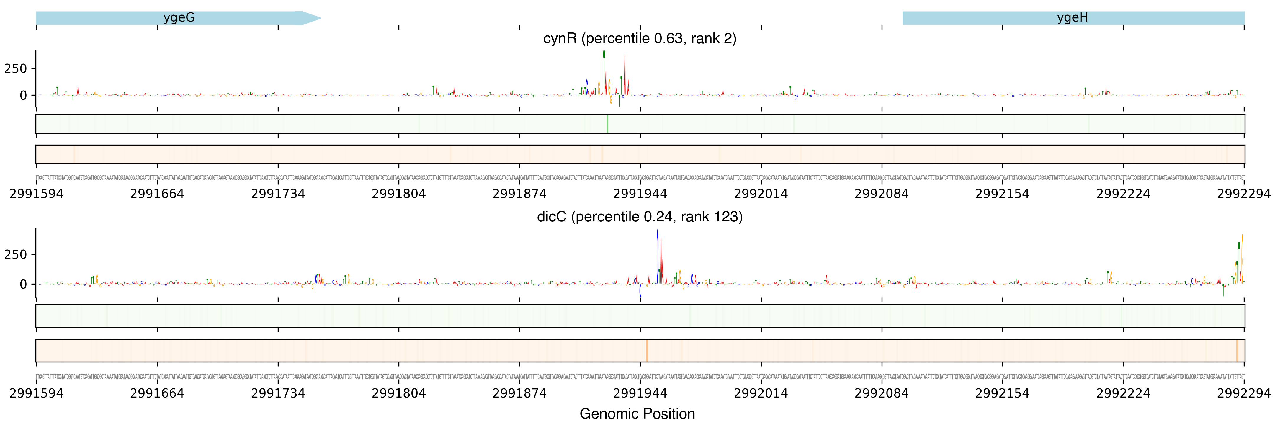 Top row shows gene annotations. Each set of panels beneath the annotation row shows the predictions for one TF. The sequence logo shows the contribution of the base at each position to the overall binding affinity, with bases above the horizontal axis contributing positive binding affinity and bases below contributing negative binding affinity. The heatmaps below the sequence logos show the exponentiated binding score at each position (the exponentiated score of the weight matrix and bias at that position). The top heatmap in green shows hits on the positive strand, and the bottom heatmap in red shows hits on the negative strand.
