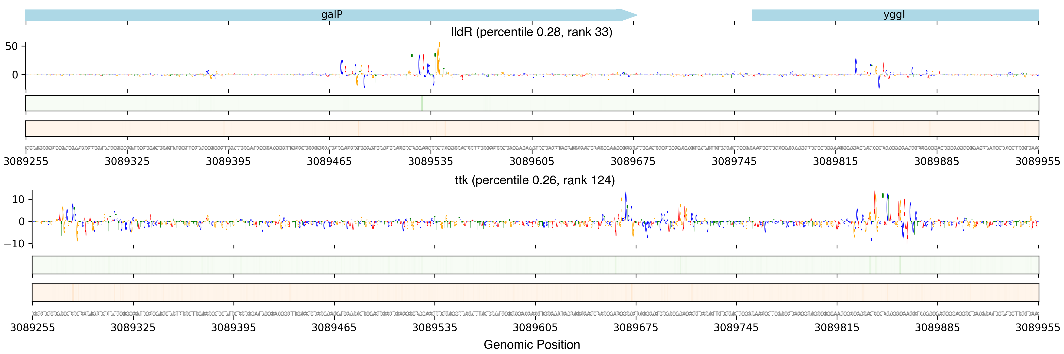 Top row shows gene annotations. Each set of panels beneath the annotation row shows the predictions for one TF. The sequence logo shows the contribution of the base at each position to the overall binding affinity, with bases above the horizontal axis contributing positive binding affinity and bases below contributing negative binding affinity. The heatmaps below the sequence logos show the exponentiated binding score at each position (the exponentiated score of the weight matrix and bias at that position). The top heatmap in green shows hits on the positive strand, and the bottom heatmap in red shows hits on the negative strand.
