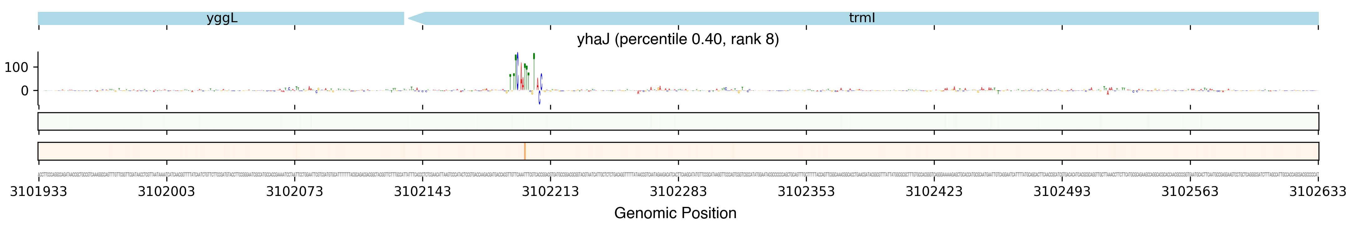 Top row shows gene annotations. Each set of panels beneath the annotation row shows the predictions for one TF. The sequence logo shows the contribution of the base at each position to the overall binding affinity, with bases above the horizontal axis contributing positive binding affinity and bases below contributing negative binding affinity. The heatmaps below the sequence logos show the exponentiated binding score at each position (the exponentiated score of the weight matrix and bias at that position). The top heatmap in green shows hits on the positive strand, and the bottom heatmap in red shows hits on the negative strand.
