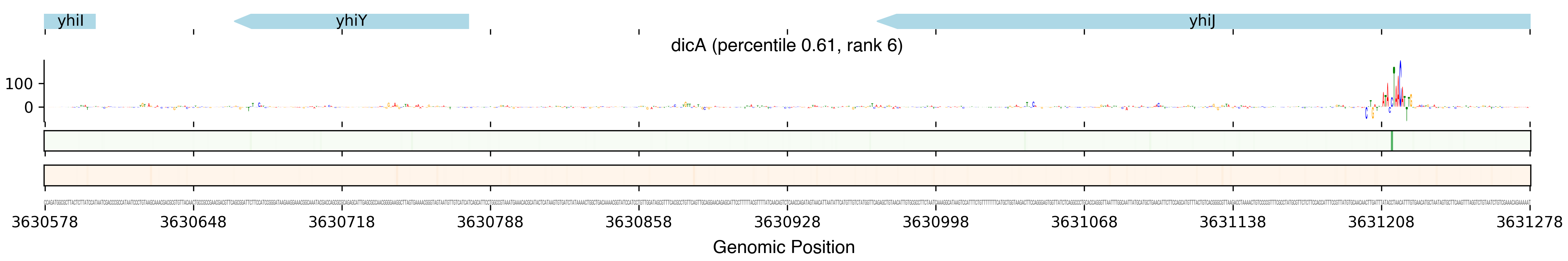 Top row shows gene annotations. Each set of panels beneath the annotation row shows the predictions for one TF. The sequence logo shows the contribution of the base at each position to the overall binding affinity, with bases above the horizontal axis contributing positive binding affinity and bases below contributing negative binding affinity. The heatmaps below the sequence logos show the exponentiated binding score at each position (the exponentiated score of the weight matrix and bias at that position). The top heatmap in green shows hits on the positive strand, and the bottom heatmap in red shows hits on the negative strand.