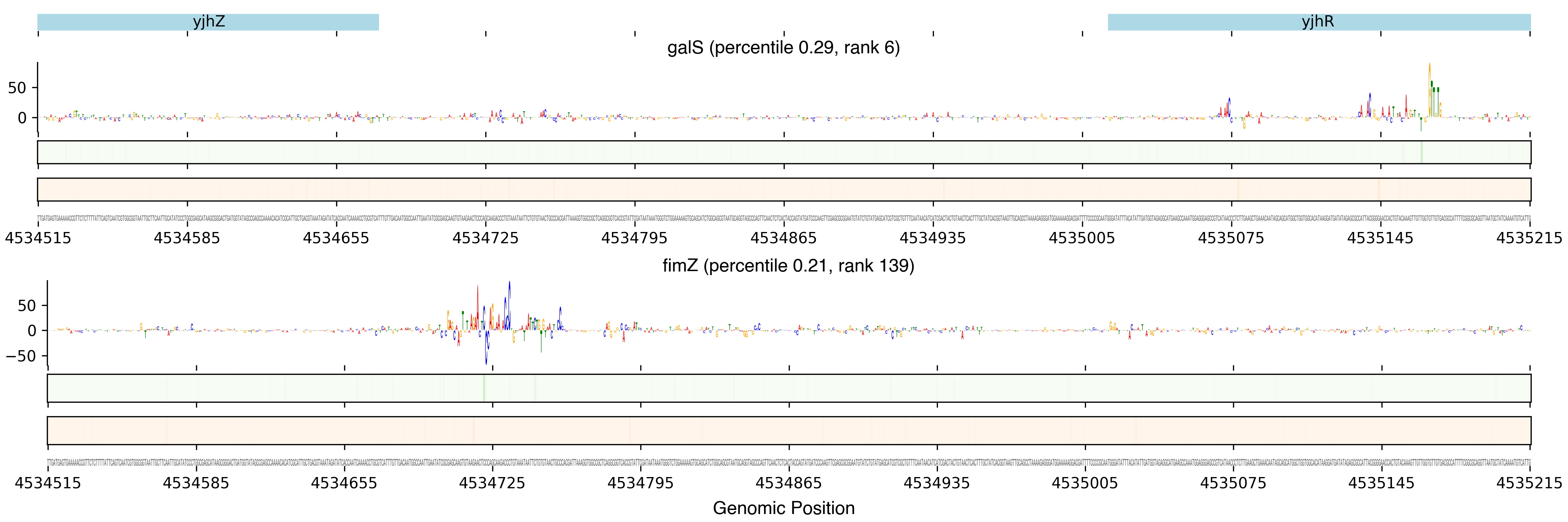 Top row shows gene annotations. Each set of panels beneath the annotation row shows the predictions for one TF. The sequence logo shows the contribution of the base at each position to the overall binding affinity, with bases above the horizontal axis contributing positive binding affinity and bases below contributing negative binding affinity. The heatmaps below the sequence logos show the exponentiated binding score at each position (the exponentiated score of the weight matrix and bias at that position). The top heatmap in green shows hits on the positive strand, and the bottom heatmap in red shows hits on the negative strand.